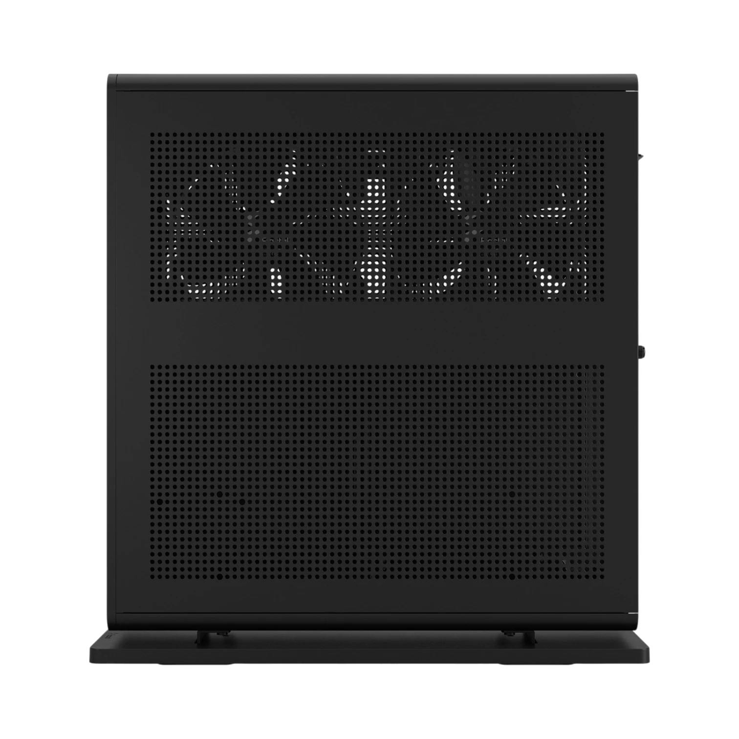 Rubber-lined feet provide stability whether the case is placed vertically beside a monitor or horizontally under a TV, adapting to your available space and setup preferences. The ventilated panels on all sides ensure that airflow is never restricted, supporting effective cooling from the two pre-installed fans.