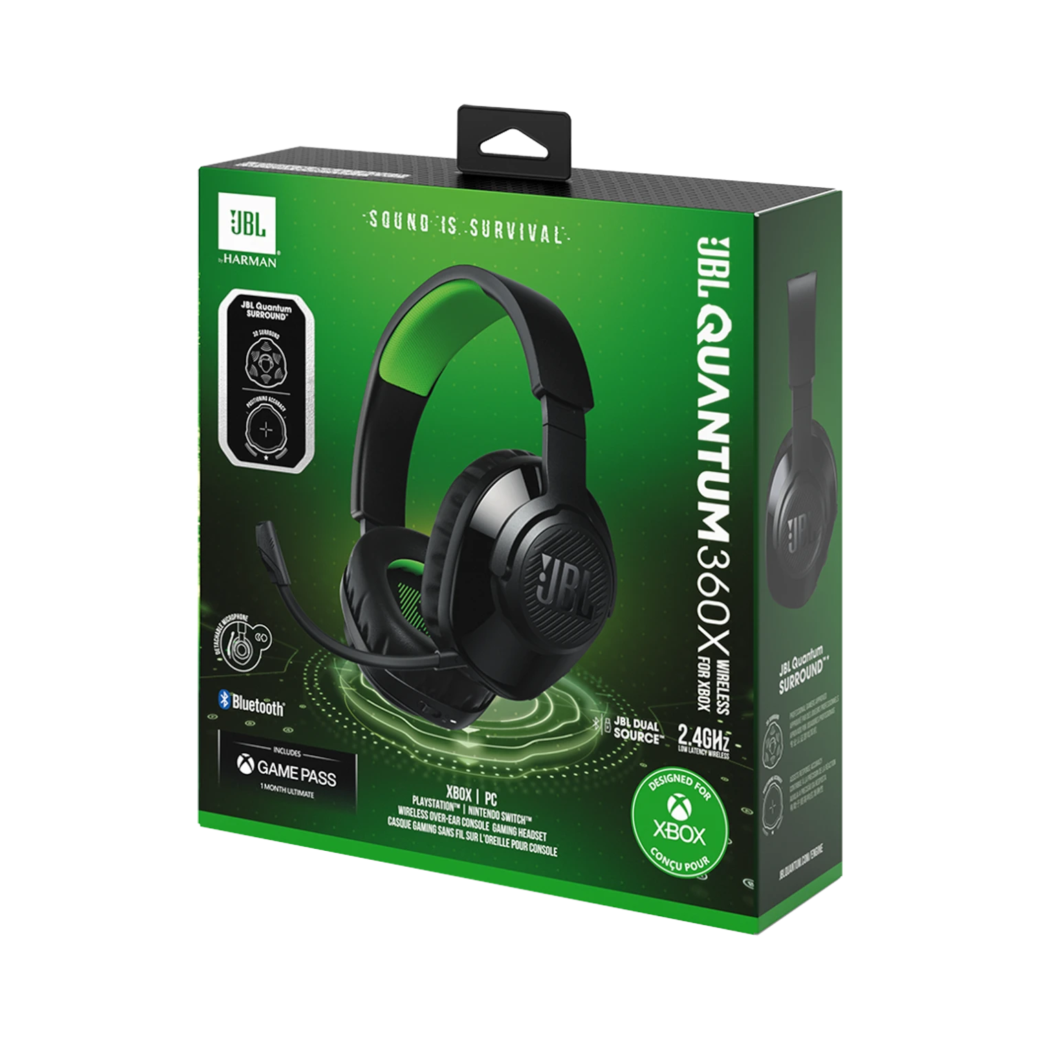 The JBL JBLQ360XWLBLKGRNAM is a wireless over-ear gaming headset designed to deliver immersive sound and comfort for serious gamers. It connects to Xbox consoles via a 2.4 GHz USB dongle and switches seamlessly to Bluetooth 5.2 for mobile devices and other consoles. Equipped with 40 mm drivers featuring JBL QuantumSOUND technology, it provides clear audio detail and spatial awareness, enhancing both casual play and competitive gaming sessions.