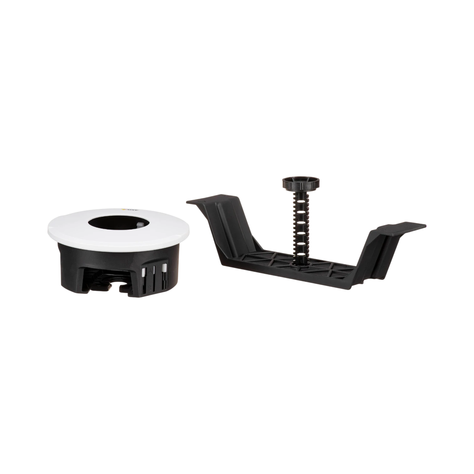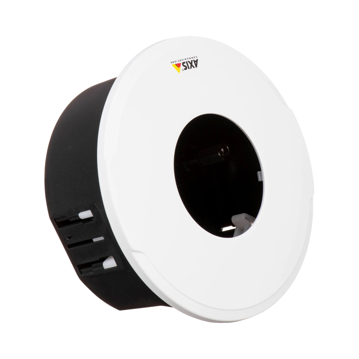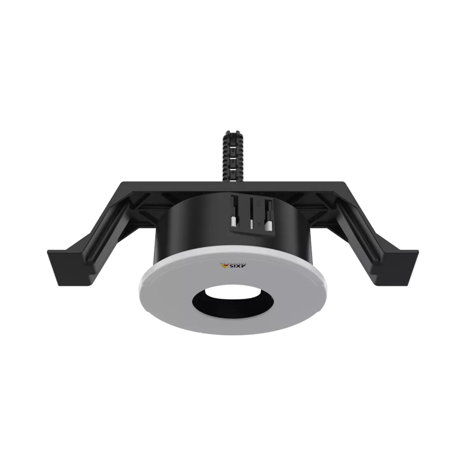 The Axis 01856-001 is a recessed ceiling mount designed specifically for Axis M30 series fixed dome cameras. It allows the camera body to be hidden above the ceiling, leaving only the clear dome and a slim white cover ring visible. This design keeps surveillance discreet while maintaining the camera’s full field of view, making it ideal for indoor environments where a subtle appearance is important.