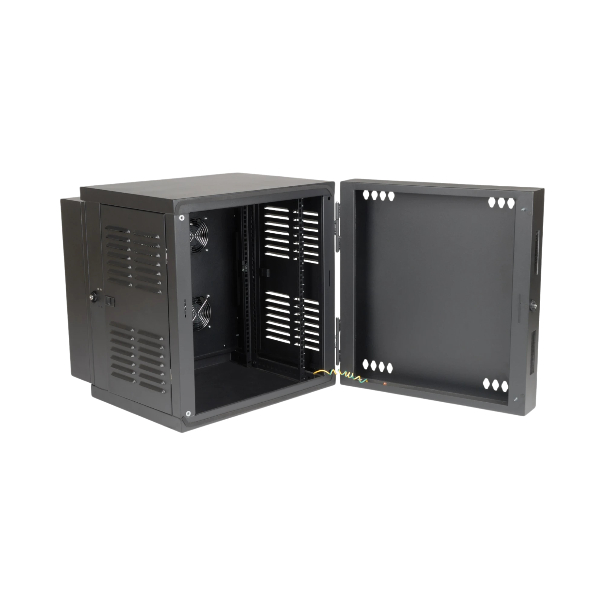 - Hinged cabinet design allows the enclosure to swing away from the wall, enabling easy rear access for maintenance without removing the rack
