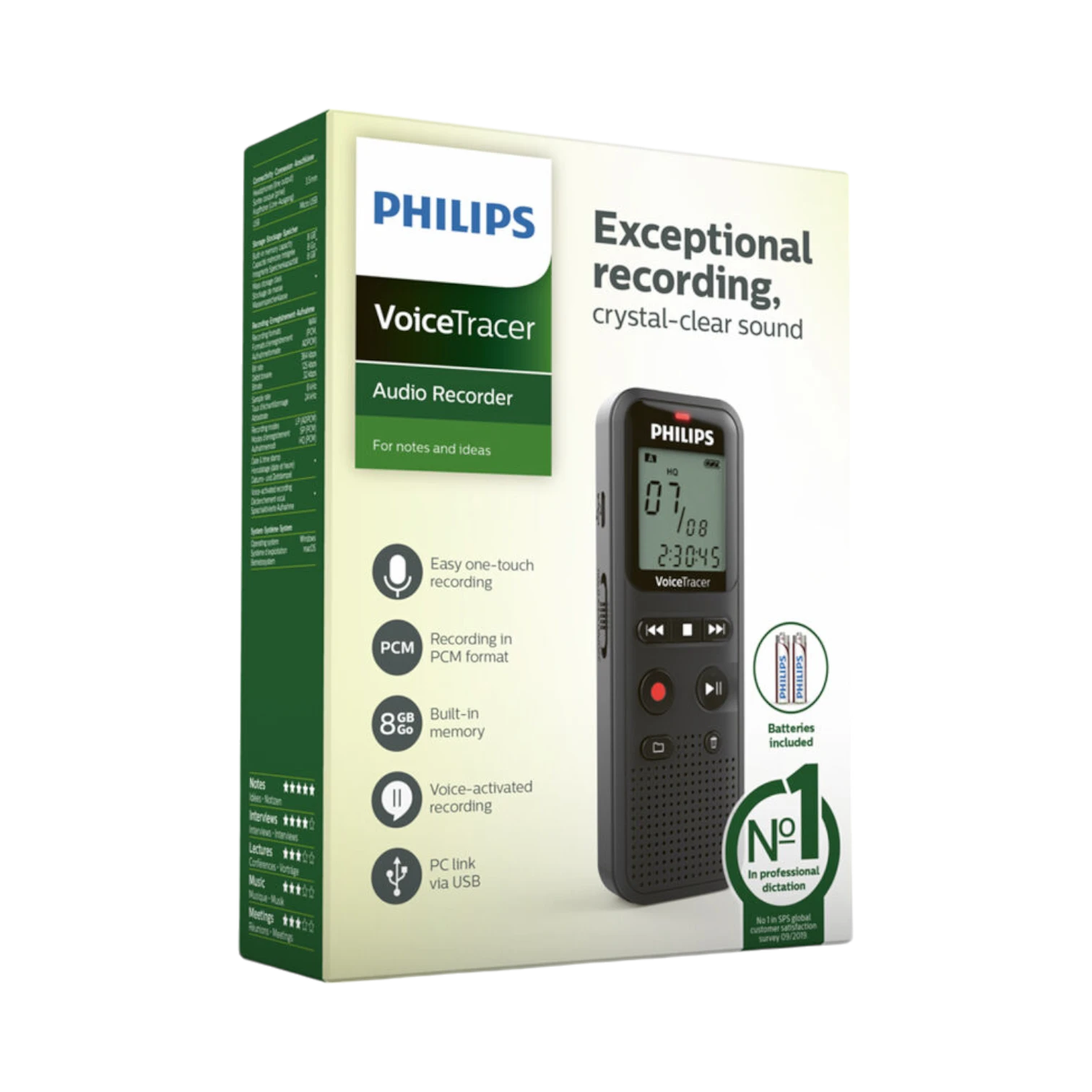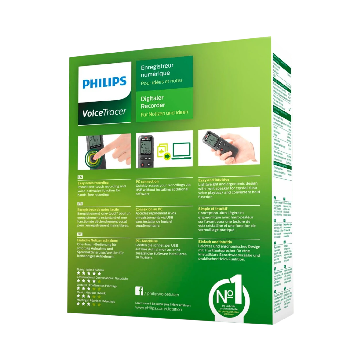 The Philips DVT1160 is a digital voice recorder designed to capture notes, ideas, and conversations with ease and reliability. It offers 8GB of internal memory, allowing up to 590 hours of audio storage, making it suitable for long meetings, lectures, or personal dictations. The device features voice-activated recording to start capturing sound automatically when you speak, reducing unnecessary silence and enabling hands-free operation.