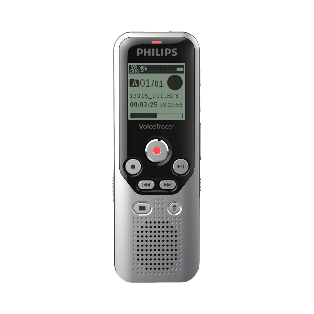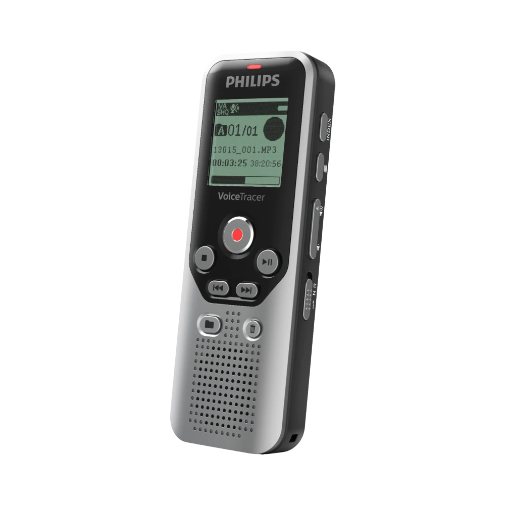 The Philips DVT1250 is a digital voice recorder designed to capture clear audio in various settings such as lectures, meetings, and personal notes. It features 8GB of built-in flash memory, expandable up to 32GB with a microSD card, providing ample storage for extended recording sessions. With three recording modes and voice-activated recording, it offers flexibility and convenience for users who need reliable audio capture without constant manual control.