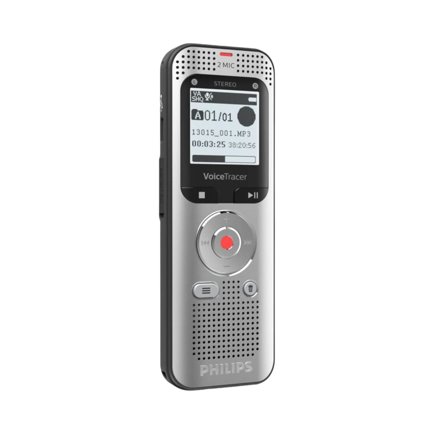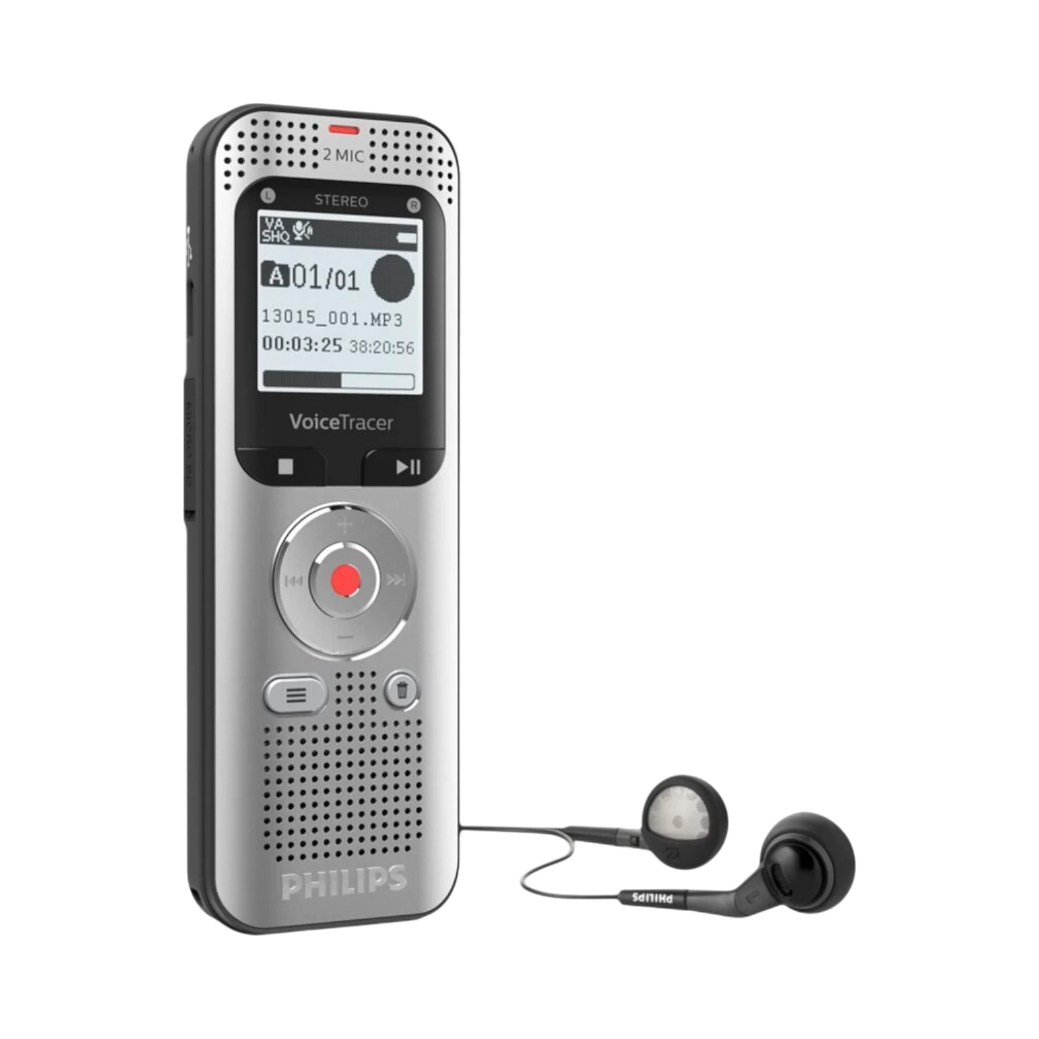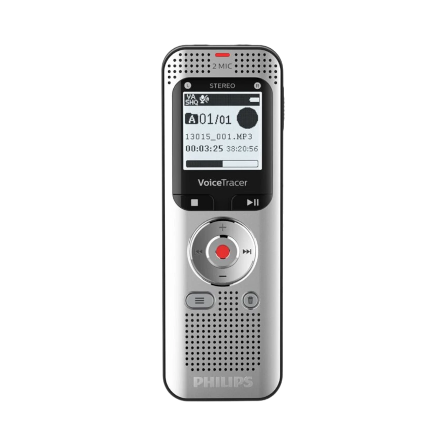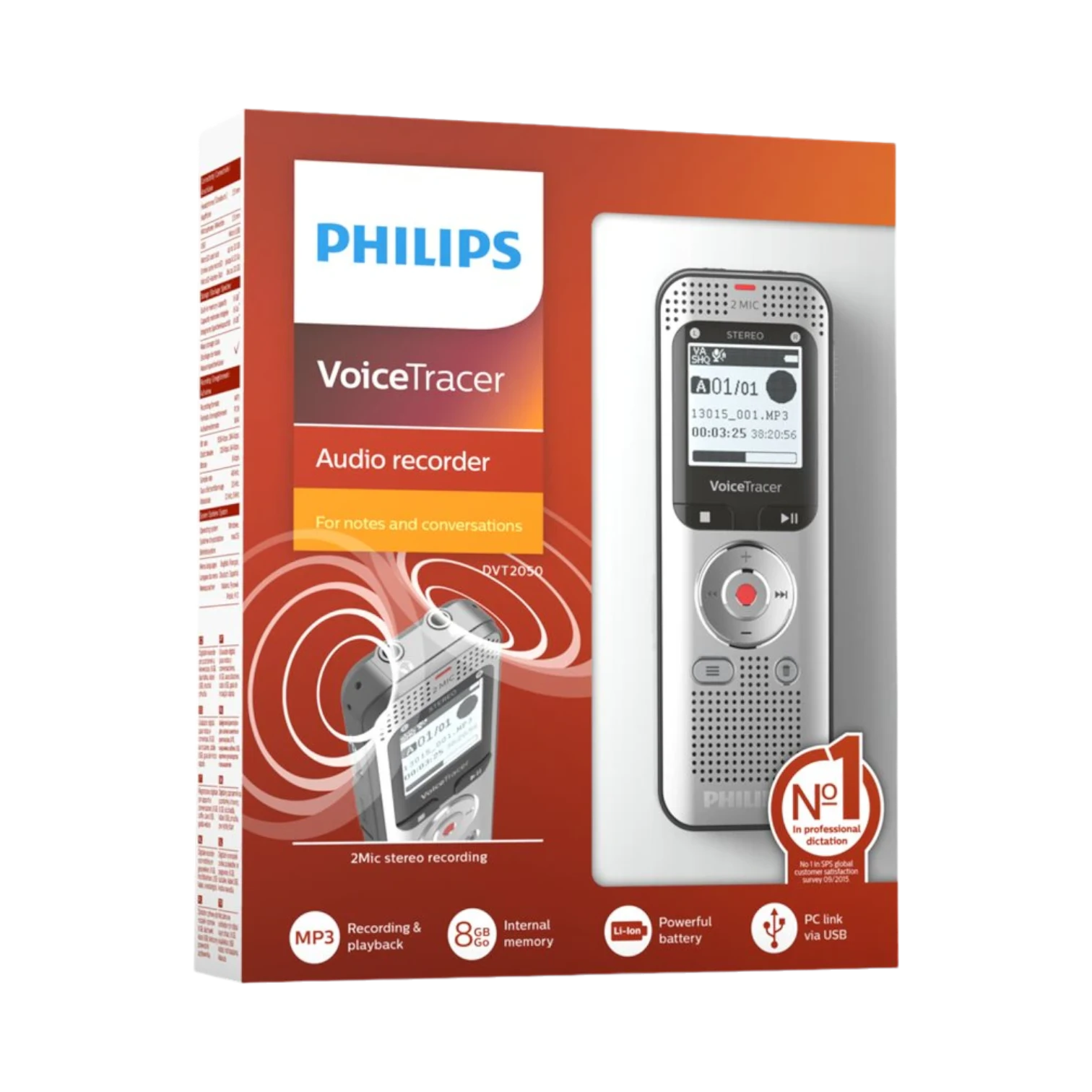 The Philips DVT2050/00 is a portable audio recorder designed to capture clear and reliable sound in a variety of settings, from meetings and lectures to interviews and field recordings. It features two stereo microphones that deliver natural and detailed voice capture, ensuring playback is easy to understand. With 8 GB of internal memory and support for microSD cards up to 32 GB, it offers ample storage for extended recording sessions. The built-in 1300 mAh battery provides up to 50 hours of continuous use, making it suitable for long days without needing a recharge.