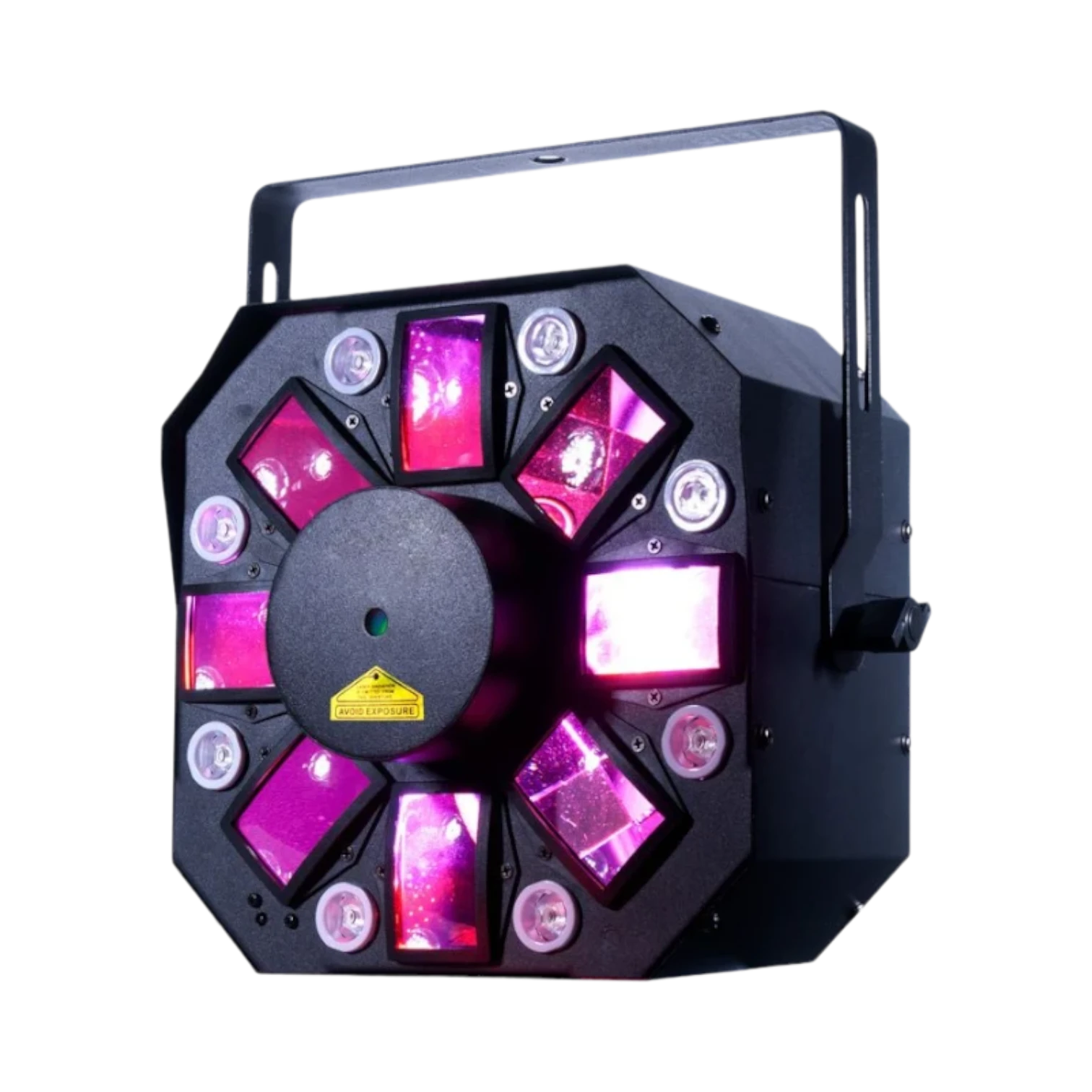 - Moonflower, strobe, and laser effects integrated into one fixture for versatile lighting displays