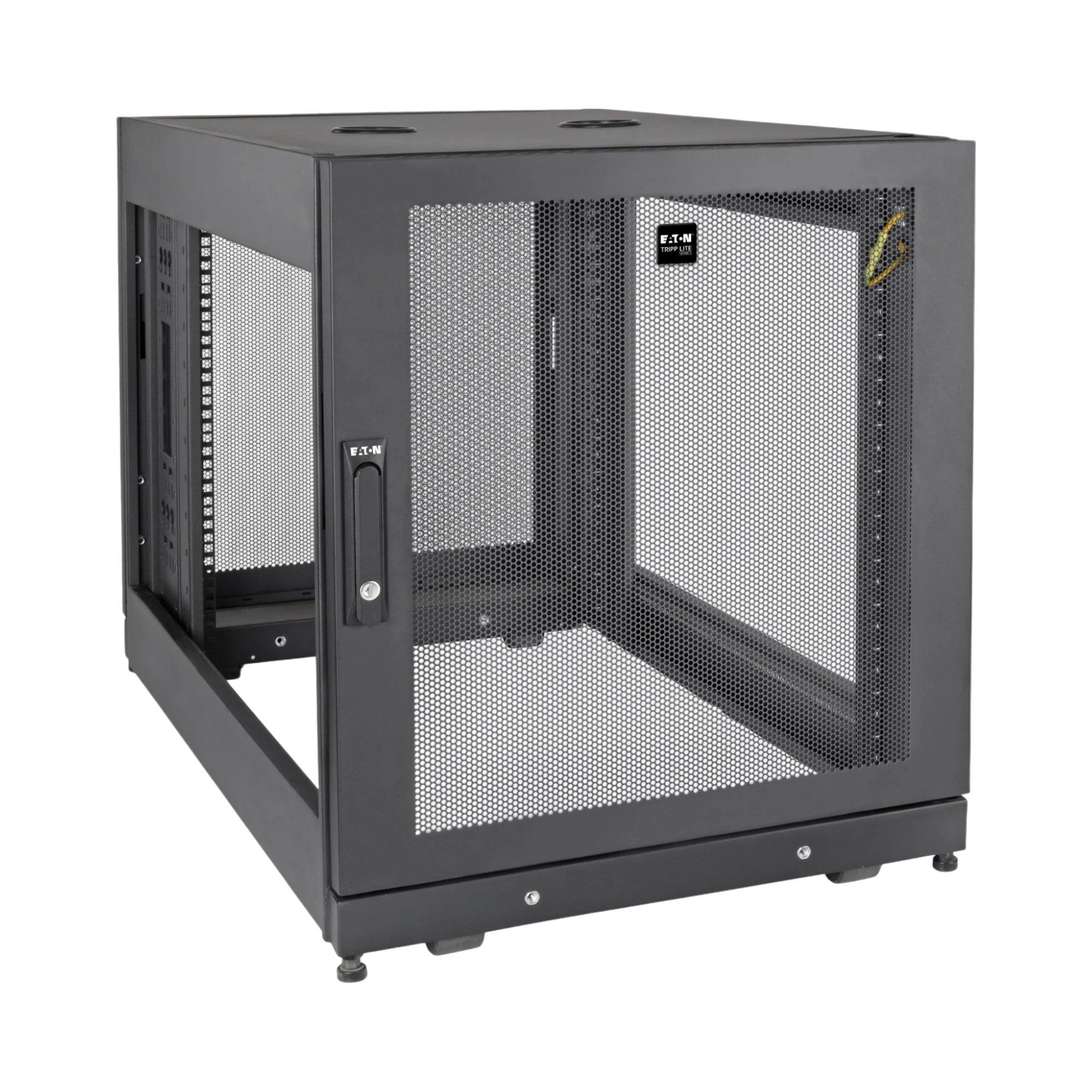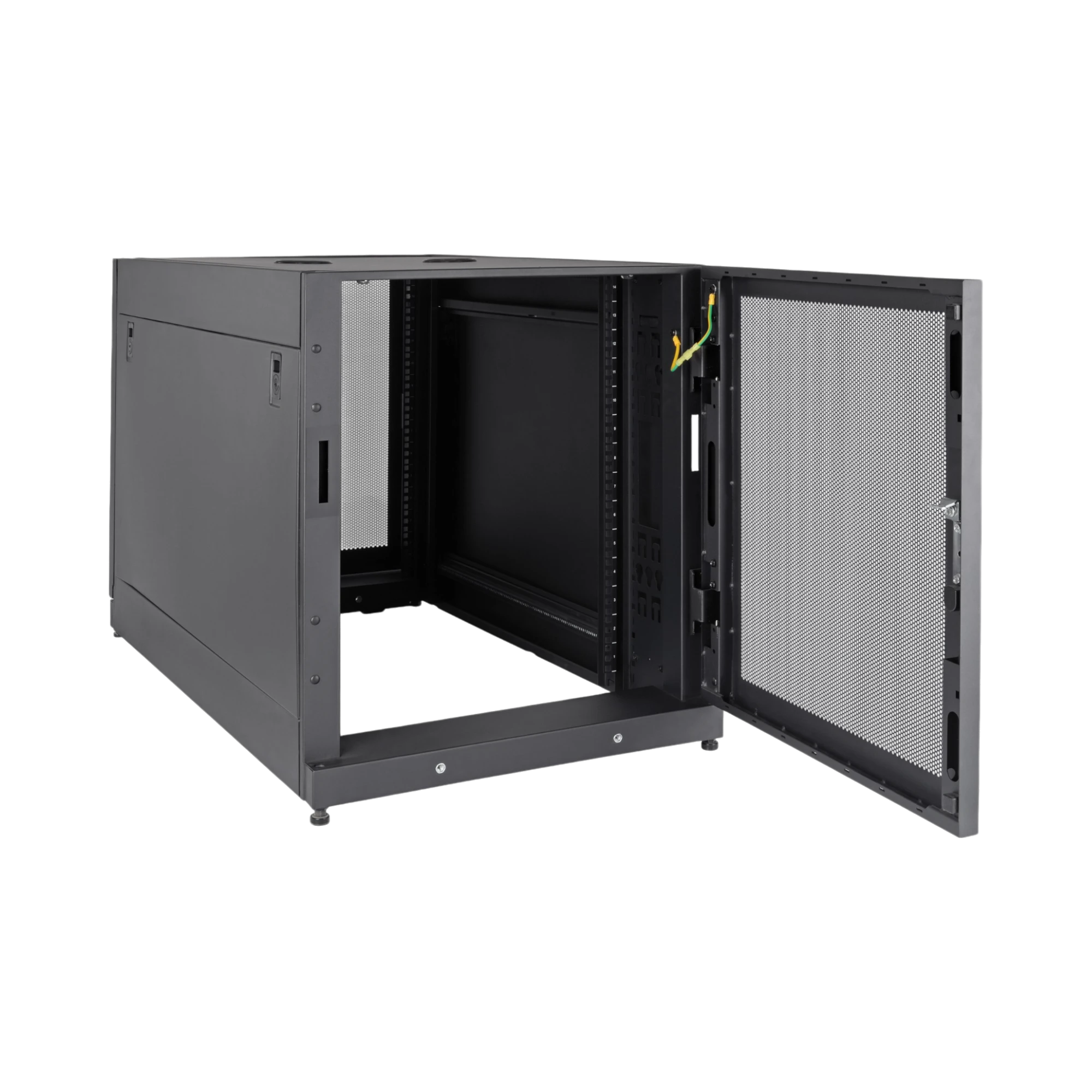 The SR14UBDP ships fully assembled, saving time and effort during installation. Its metal casters allow you to position the rack easily before securing it in place. The reversible doors and removable side panels simplify equipment installation and maintenance, while the adjustable mounting rails provide precise alignment for your devices. Cable management features help keep your setup tidy and accessible.