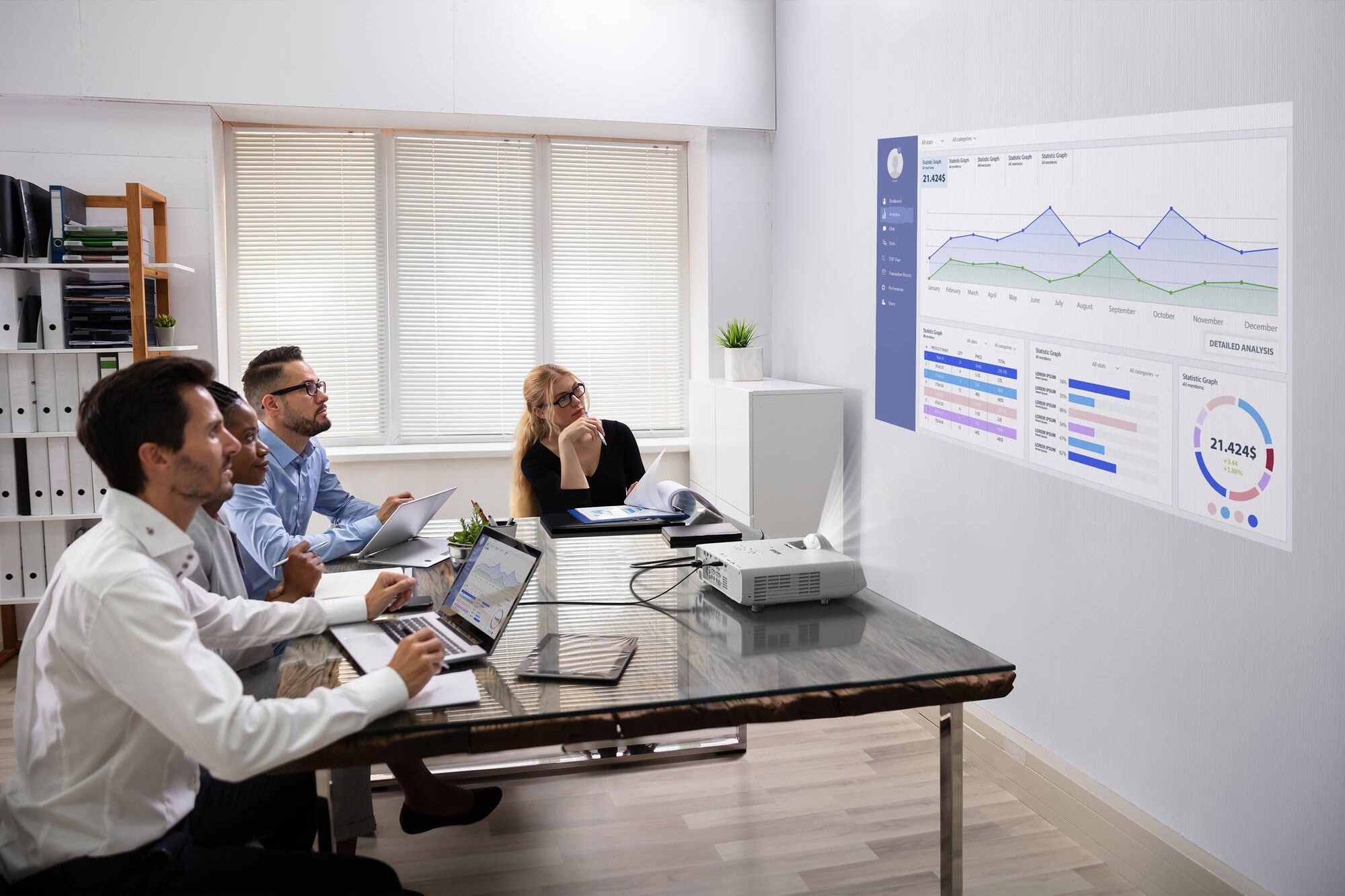 The short-throw design minimizes shadows by allowing presenters to stand close to the screen without blocking the image, making it ideal for tight spaces. Wireless connectivity options, including Miracast, enable easy content sharing from multiple devices, while the built-in 16W speaker provides clear sound without the need for additional audio equipment.