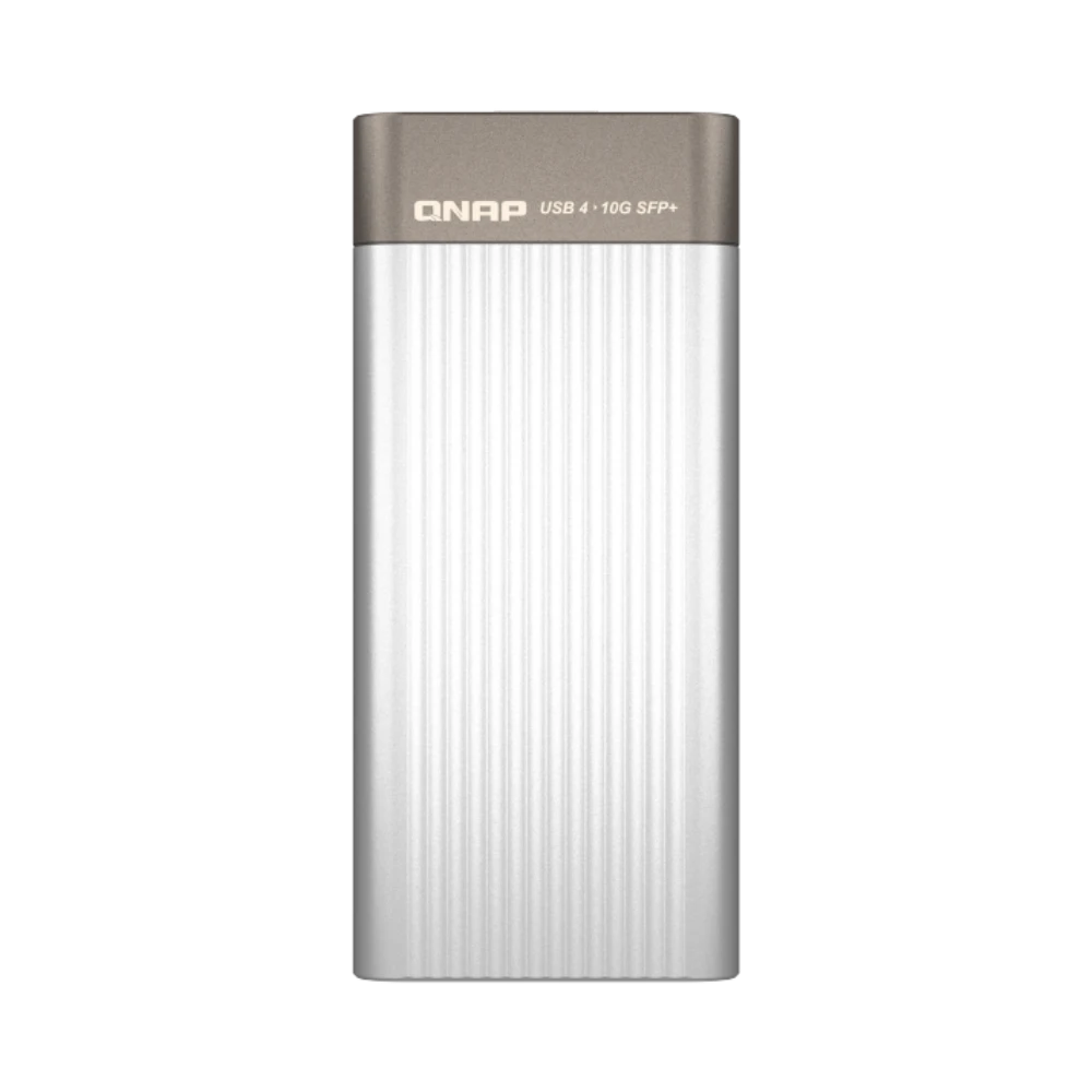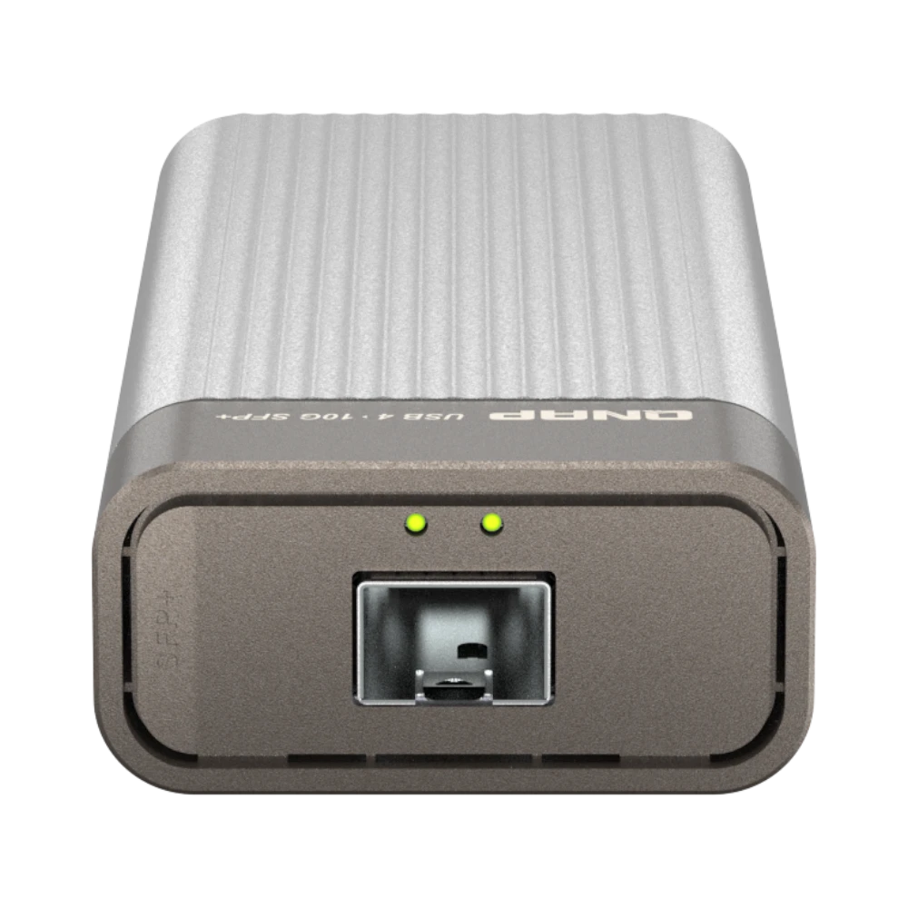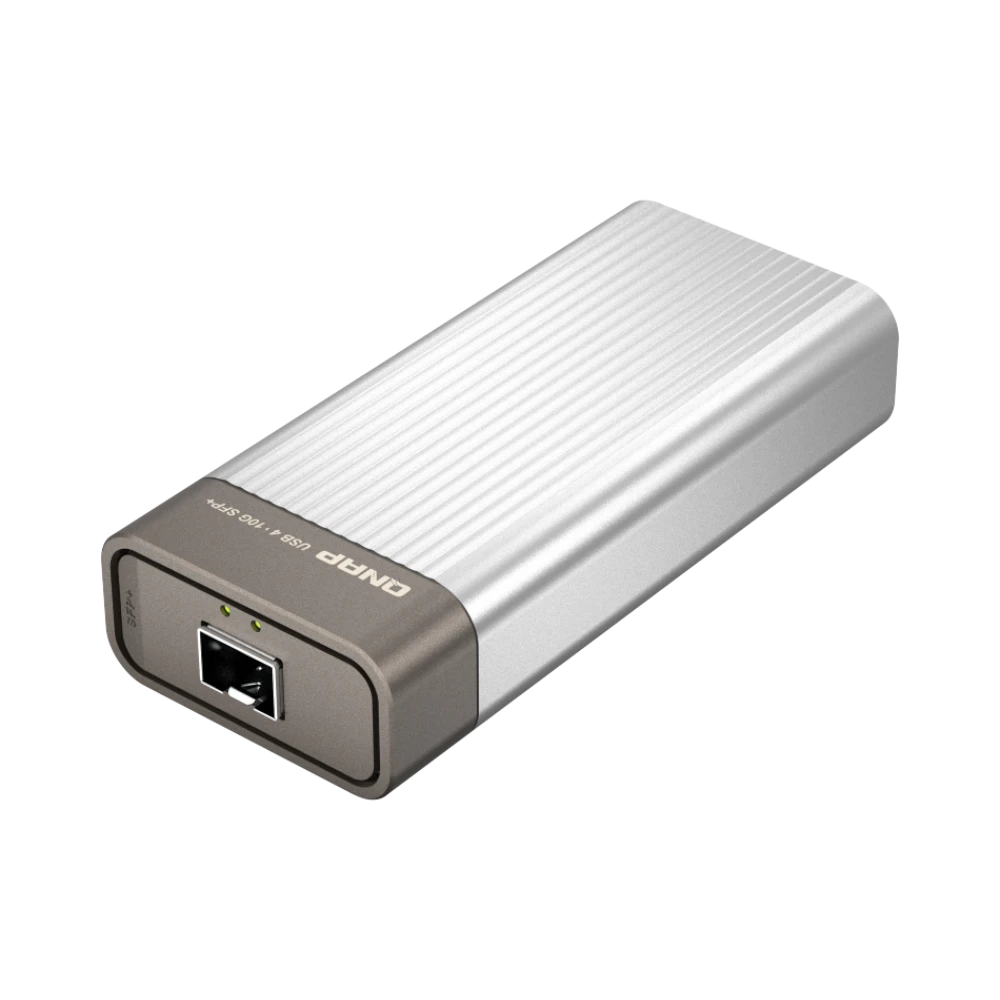 The QNAP QNA-UC10G1SF is a compact network adapter designed to connect computers with USB4 or Thunderbolt 3 or 4 ports to 10 GbE networks via an SFP+ module. It enables laptops and desktops to achieve high-speed data transfers up to 10 Gb/s, making it suitable for demanding tasks like streaming uncompressed 8K video, backing up large media files, or gaming on low-latency servers. Its fanless metal enclosure ensures quiet operation and reliable heat dissipation during extended use.