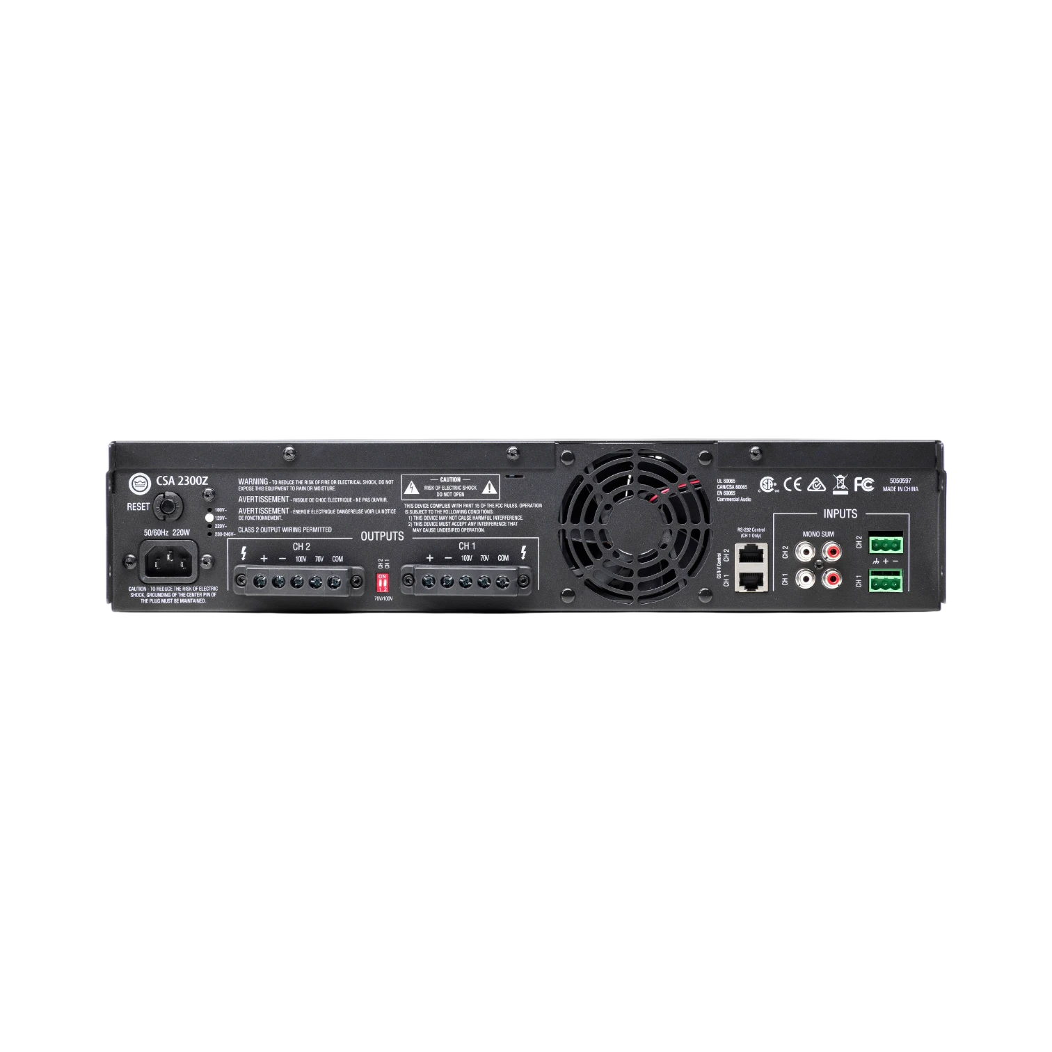 The CSA2300Z is designed for straightforward installation in standard 2U rack spaces, with mounting hardware included for convenience. Its wide voltage range from 100 to 240 VAC makes it adaptable to different power environments worldwide. The amplifier’s controls for bass and treble on each channel allow installers to fine-tune audio performance to match room acoustics and speaker characteristics, ensuring optimal sound quality in any setting.