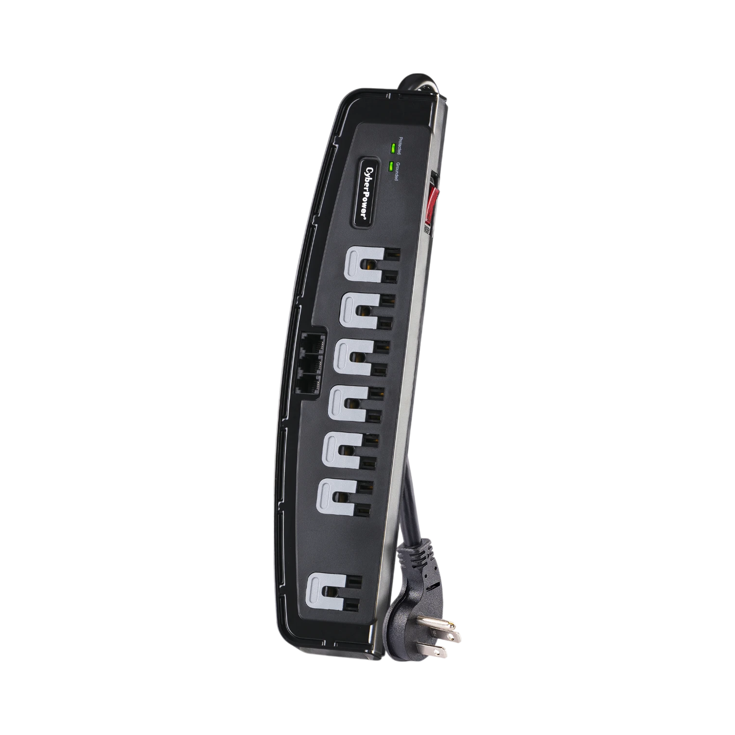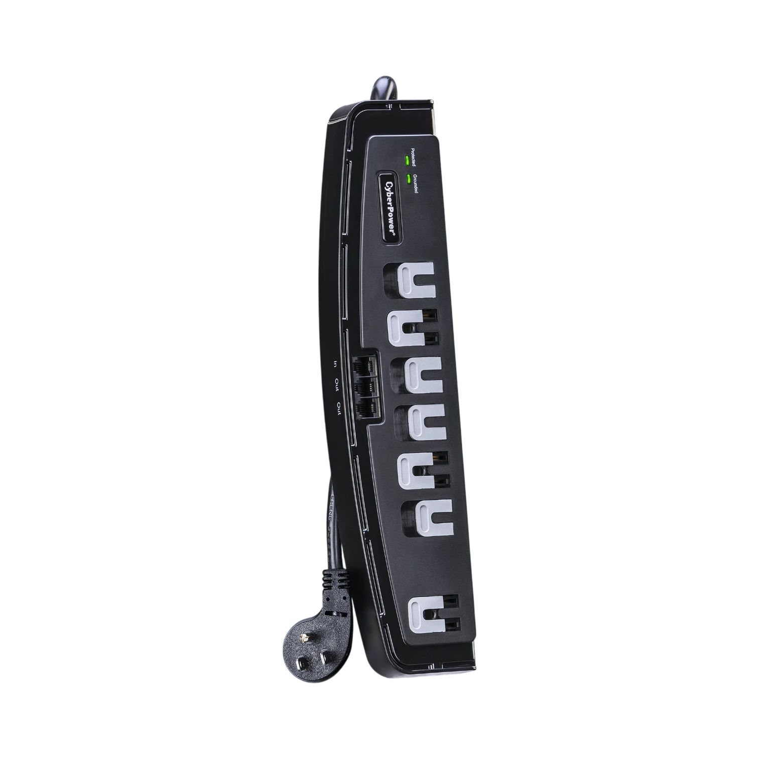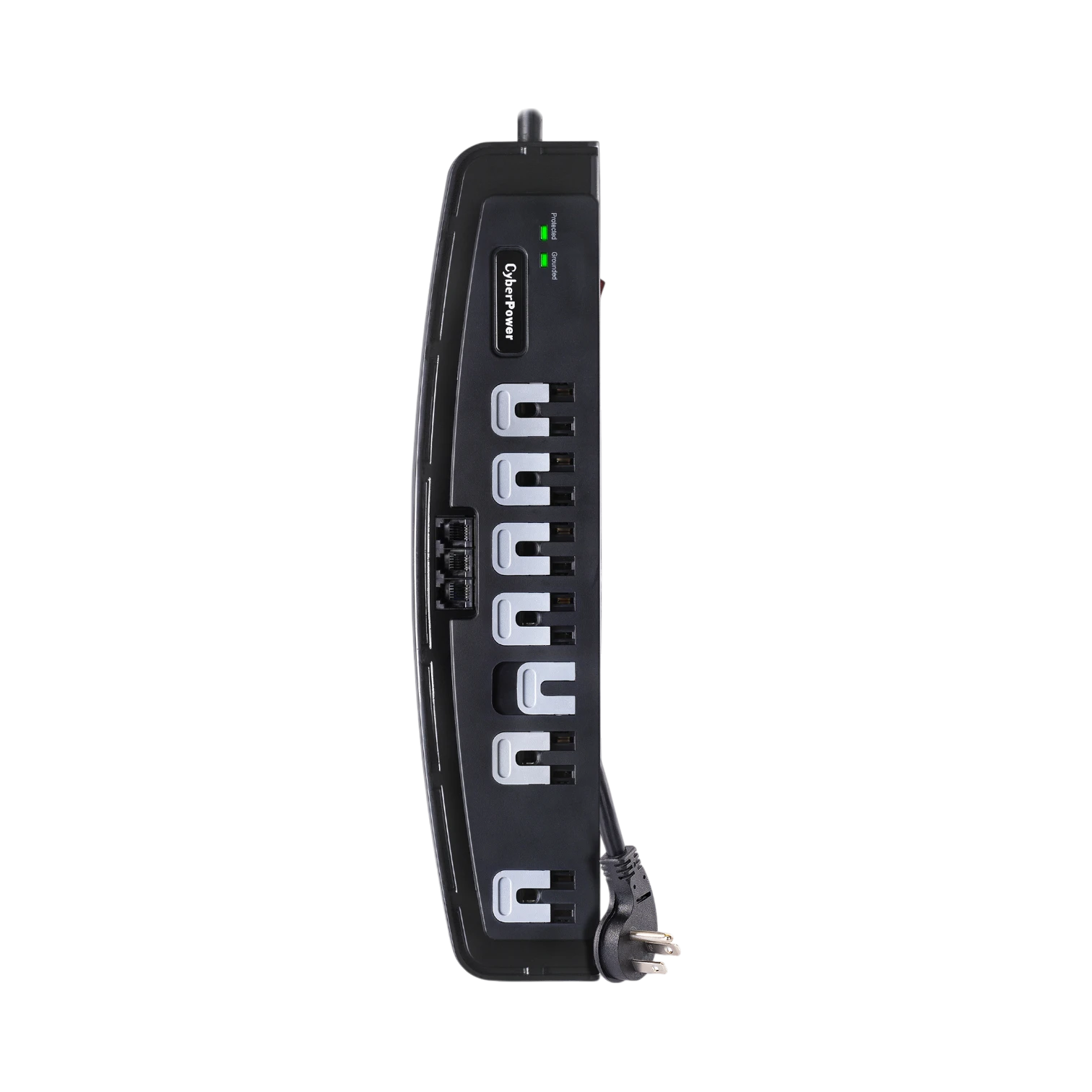 The CyberPower CSP708T is a professional surge protector designed to shield your essential electronics from damaging power surges and spikes. It features seven surge-protected outlets, including one transformer-spaced outlet to accommodate larger plugs without blocking adjacent sockets. With 1650 joules of surge protection, it provides robust defense for devices in home or office environments. Additional protection for phone lines and DSL modems is included through built-in RJ11 ports, while an EMI/RFI noise filter helps reduce electrical interference, enhancing audio and video clarity.