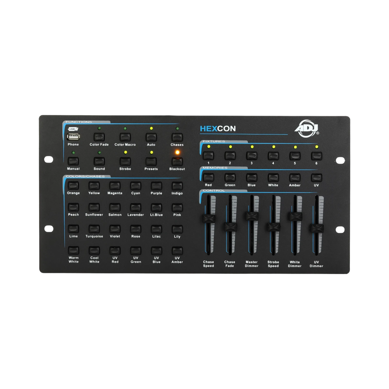 The controller integrates seamlessly with ADJ HEX Series wash lights via a standard 3-pin XLR DMX output, ensuring reliable communication and control. The USB port adds convenience by allowing you to charge mobile devices during events, which is especially useful for DJs and event producers on the move.