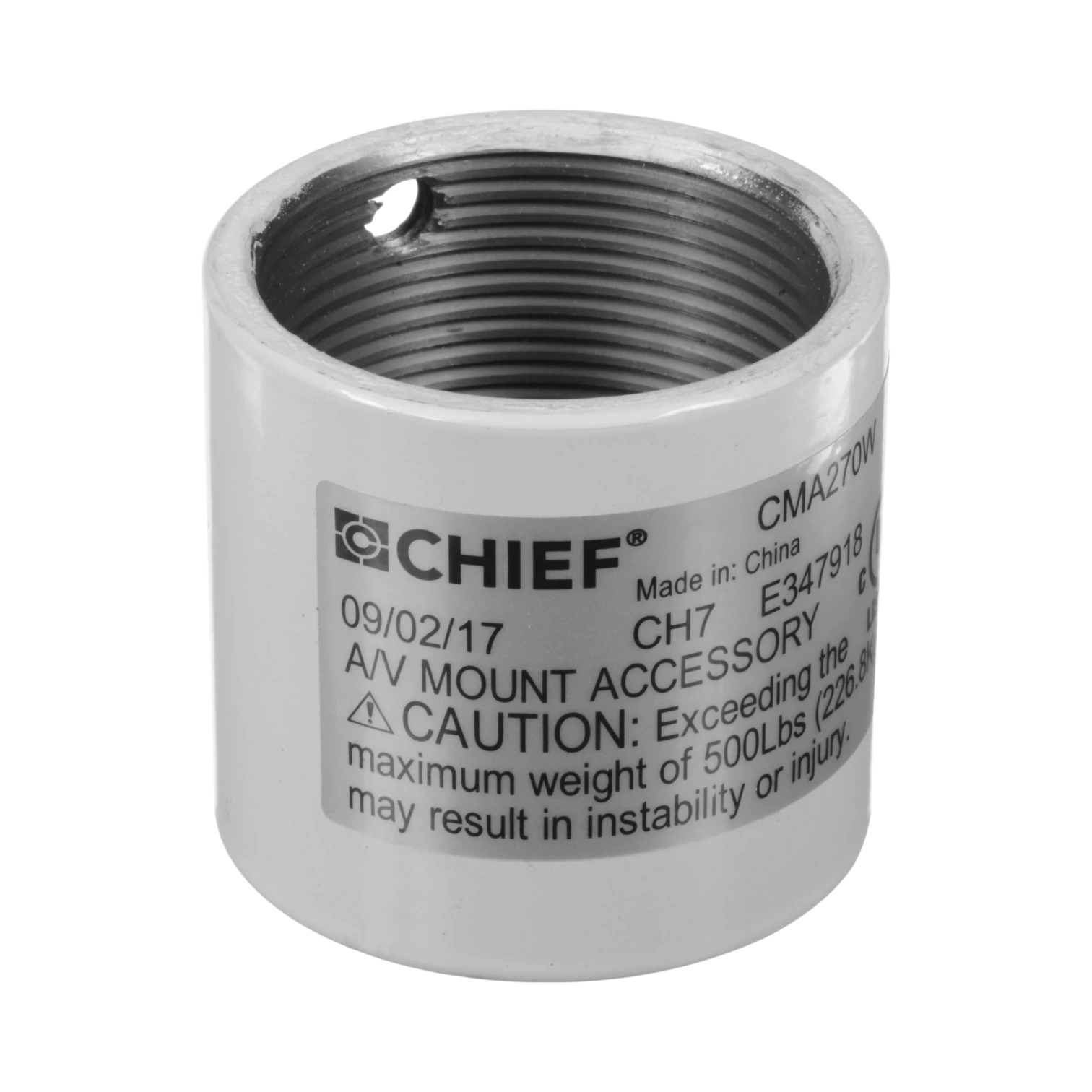 The Chief CMA270W is a white threaded pipe coupler designed to join two 1.5-inch NPT threaded columns, extending the length of your installation by 2.06 inches. It provides a secure and stable connection for load-bearing setups, supporting weights up to 500 pounds. This coupler is ideal for applications such as mounting AV equipment or structural projects where strength and safety are essential.