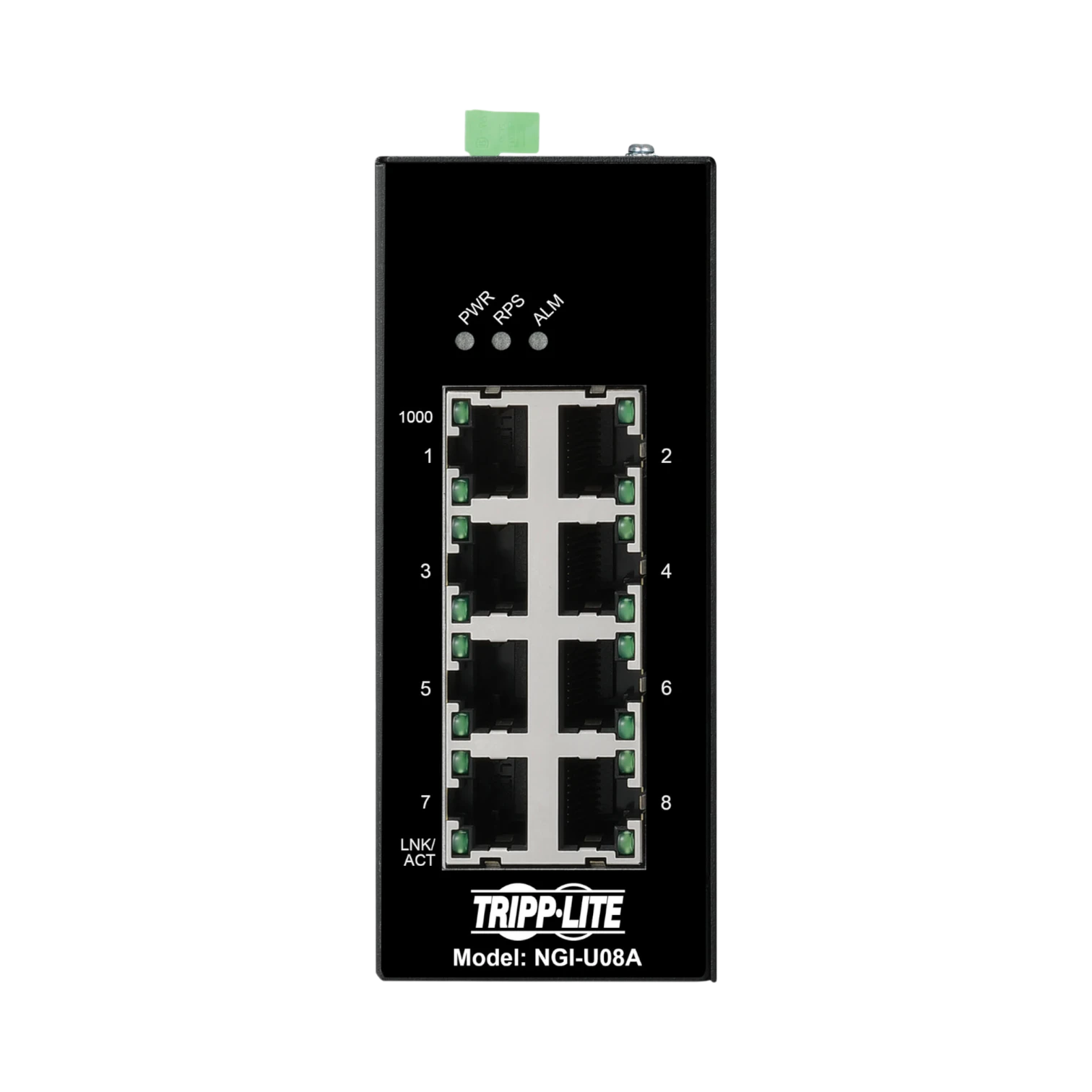 The Tripp Lite NGI-U08A is an industrial-grade 8-port Gigabit Ethernet switch designed to expand network connectivity in demanding environments. It offers eight RJ45 ports that automatically adjust to 10, 100, or 1000 Mbps speeds, ensuring efficient data transfer across your local area network. Built to operate in extreme temperatures from -40° to 75°C, this switch is ideal for factory floors, warehouses, and other harsh settings where reliable network performance is critical.
