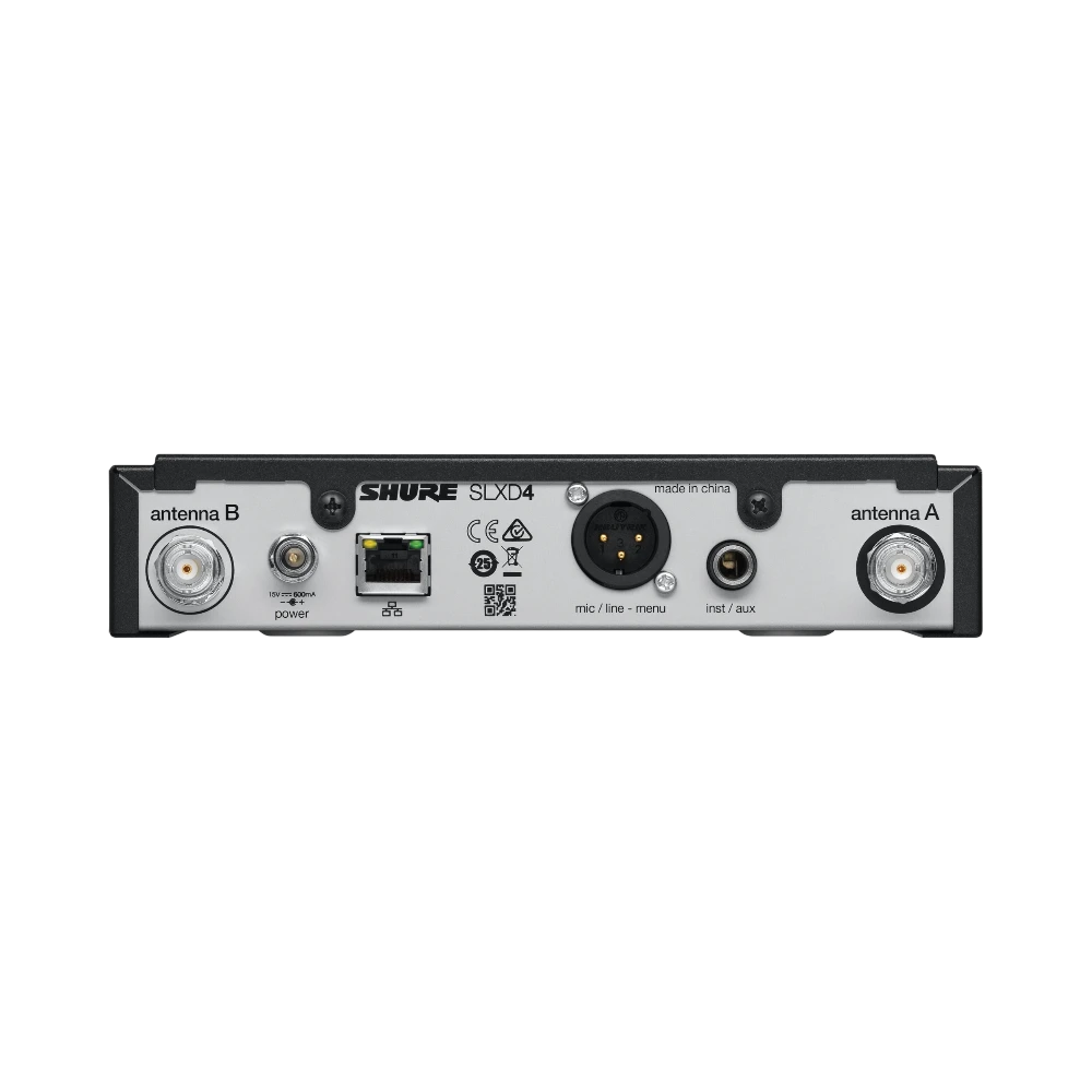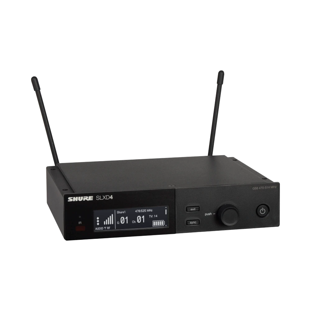 Its durable metal half-rack chassis fits easily into standard rackmount setups, making it suitable for AV installations and portable sound systems. The front panel LCD provides essential RF, audio, and battery metering information, and flexible connectivity options include both XLR and 1/4" TRS balanced audio outputs. Compatible with Shure SLXD1 and SLXD2 transmitters, the SLXD4 supports up to 32 simultaneous systems per band, making it a strong choice for mid-sized venues, corporate events, and houses of worship.