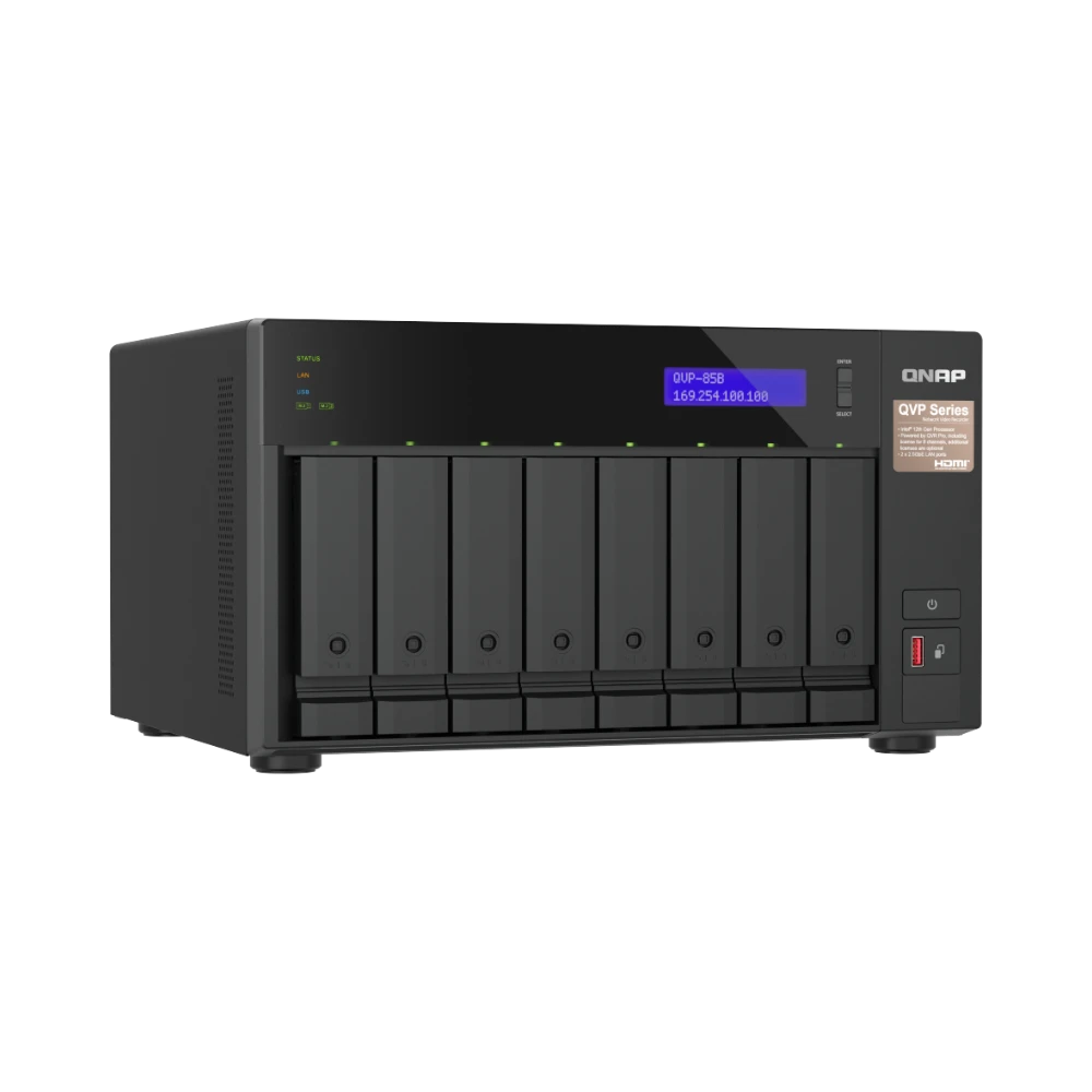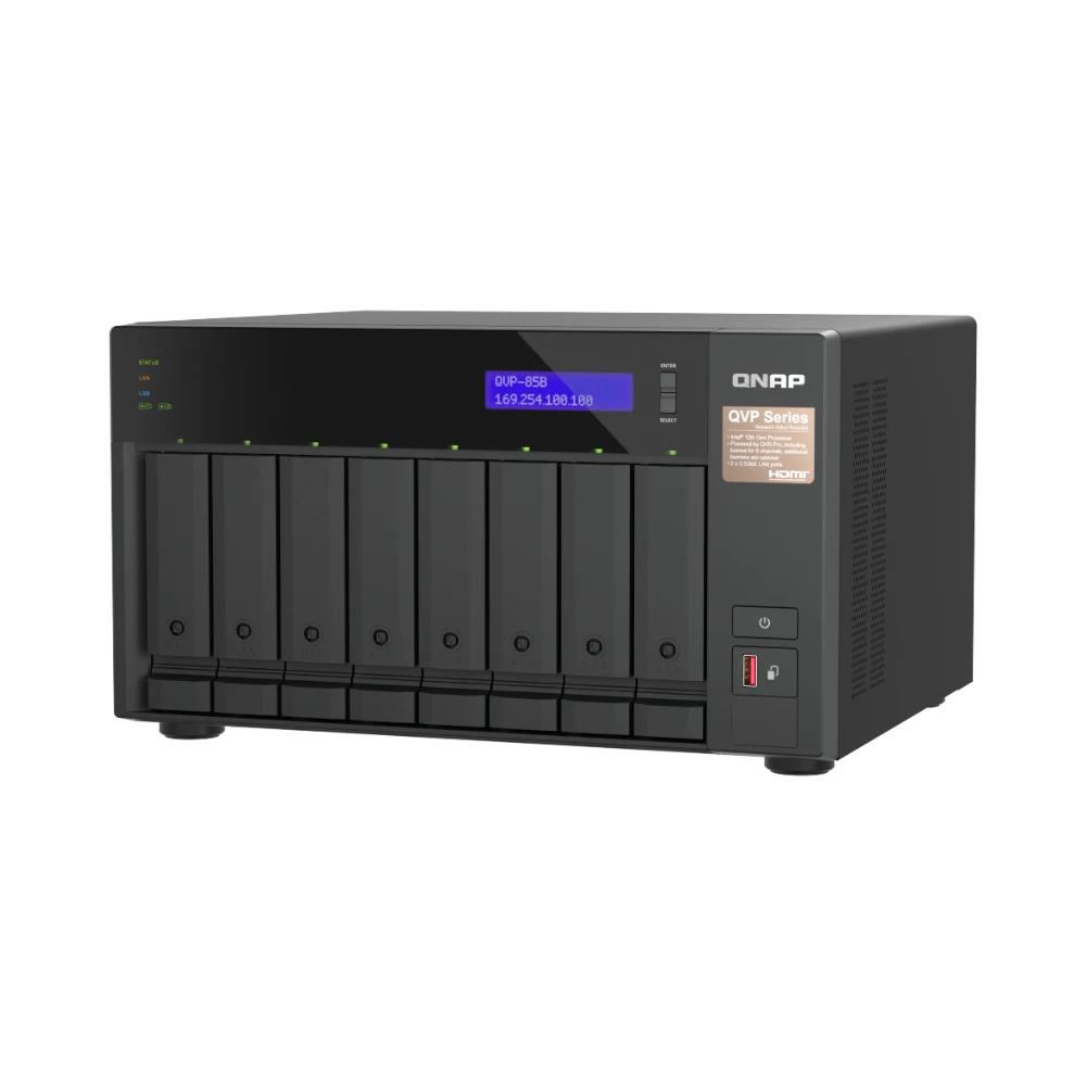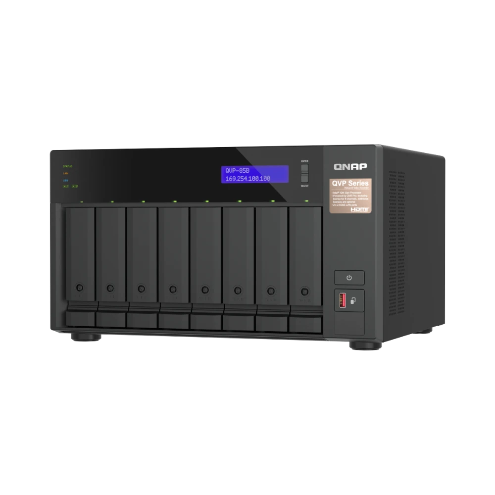 The QNAP QVP-85B-US is an 8-bay network video recorder (NVR) and NAS enclosure designed to meet the surveillance needs of small to medium-sized businesses. Equipped with an Intel Core i5 6-core processor and 32GB of RAM, it handles multiple high-resolution video streams smoothly. This system supports over 6,000 IP cameras from more than 190 brands, including ONVIF-compliant devices and USB webcams, offering broad compatibility and flexibility for expanding security setups.