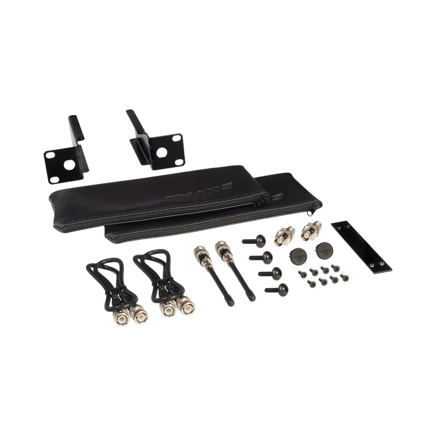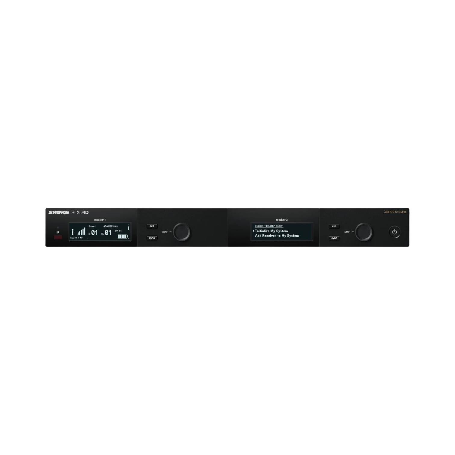 The system includes two SLXD1 bodypack transmitters and an SLXD4D dual-channel receiver housed in a rugged metal chassis that can be rack-mounted for easy integration. Setup is simplified with automatic frequency scanning and infrared sync, allowing quick pairing and minimal downtime. Each transmitter runs on two AA batteries, providing up to 8 hours of operation, with support for rechargeable batteries for extended use.