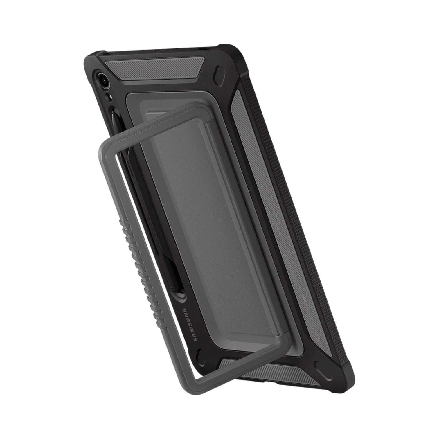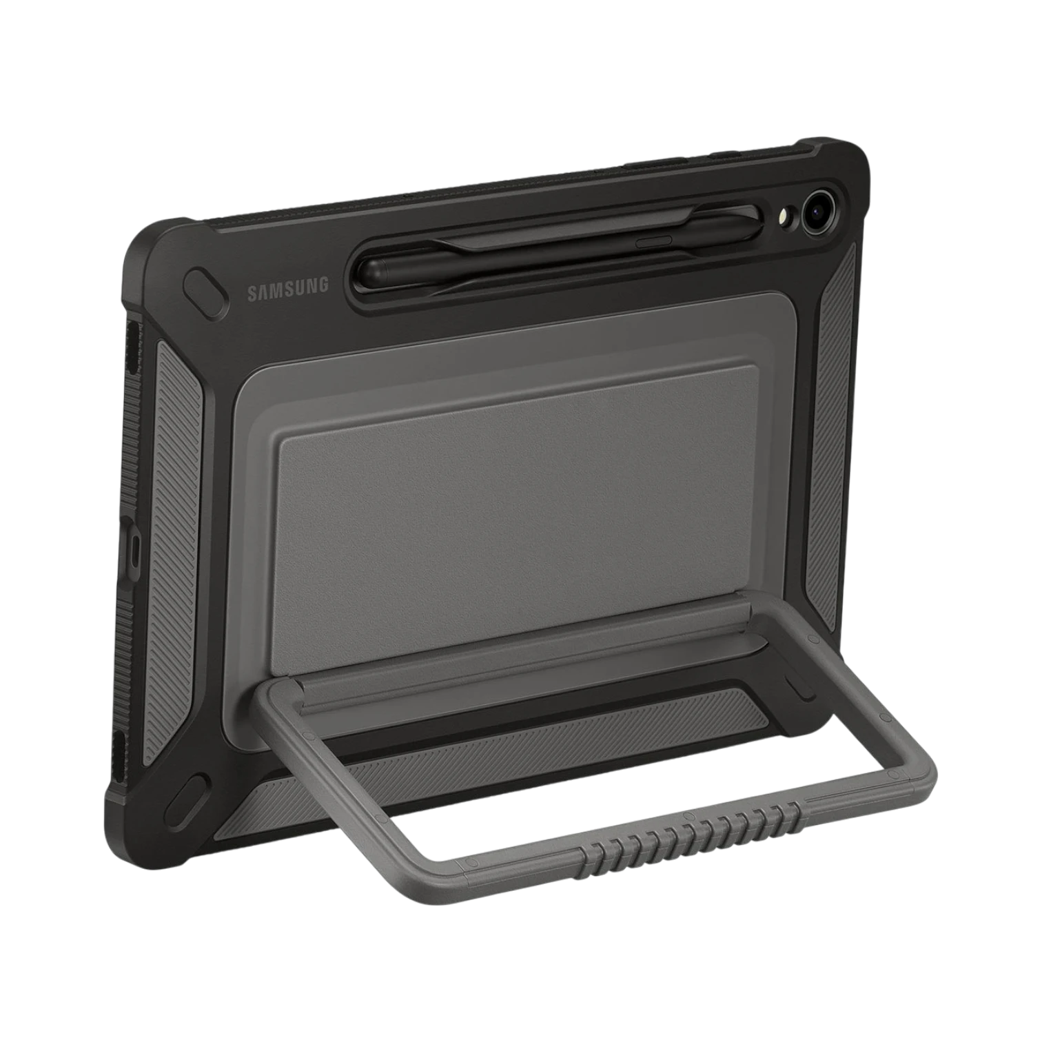 The Samsung EF-RX710CBEGUJ is an outdoor cover designed specifically for the 11-inch Galaxy Tab S9, providing robust protection and practical features for users on the go. It safeguards the tablet against drops and impacts with a durable outer shell and shock-absorbing interior, meeting the MIL-STD 810G-516.7 military standard. This cover also offers versatile viewing options and secure storage for the S Pen, making it a reliable companion for work, study, or entertainment outside traditional settings.