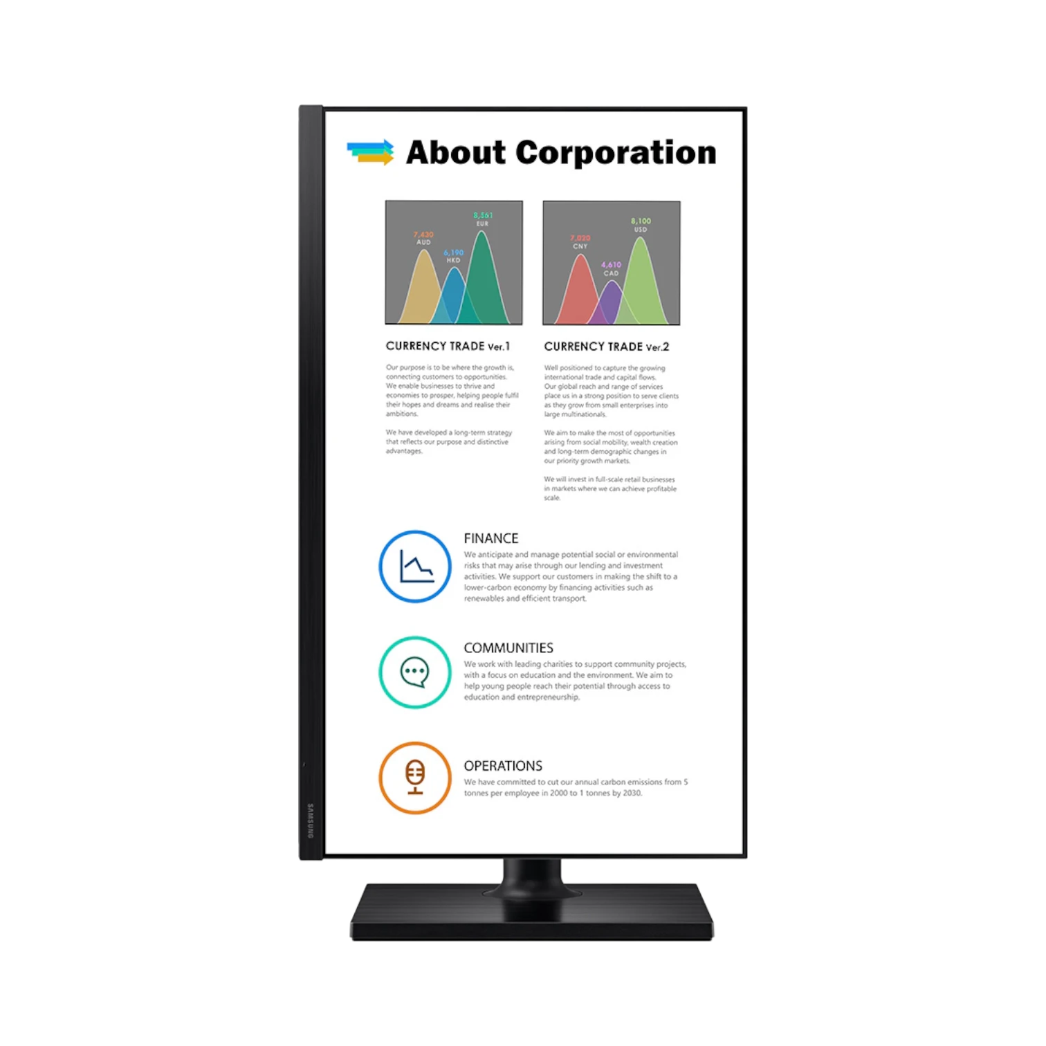 The Samsung LF27T450FZNXGO is a 27-inch professional monitor designed to deliver reliable image quality and ergonomic comfort for demanding work environments. Featuring a full HD IPS panel with 1920 x 1080 resolution and a wide 178° viewing angle, it ensures consistent colors and sharp visuals from nearly any position. The 75 Hz refresh rate combined with a 5 ms response time provides smooth motion, making it suitable for tasks ranging from detailed document review to casual gaming.