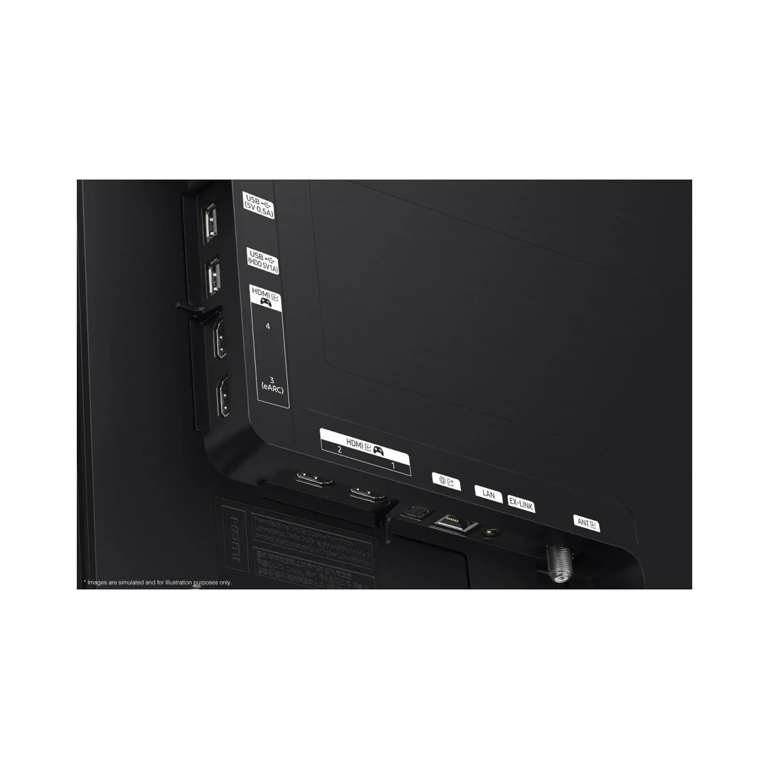 This TV offers a versatile set of connections to fit modern media setups. Four HDMI 2.1 ports support high-bandwidth signals needed for 4K gaming at high frame rates, making it compatible with the latest consoles and PCs. Wi-Fi 6 ensures smooth streaming even in busy networks, while Bluetooth 5.2 allows easy pairing with wireless headphones, speakers, or controllers. The built-in Samsung TV Hub integrates streaming services and live TV, providing a seamless entertainment experience without extra devices.