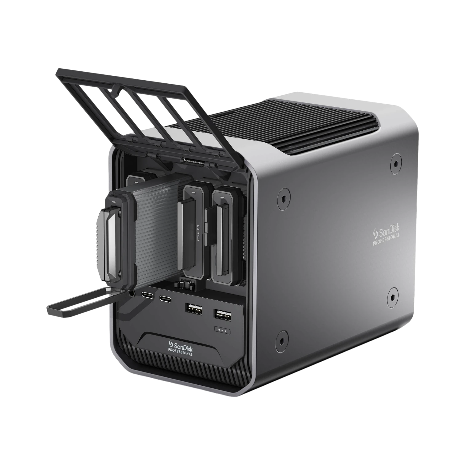The SanDisk SDPD14F-0000-NBAAD is a professional docking station designed to streamline media management and device connectivity for creative professionals. It features four dedicated PRO-READER bays that enable simultaneous offloading of multiple media cards, making it well suited for photographers, videographers, and content creators handling large data volumes. With Thunderbolt 3 connectivity, it delivers fast data transfer speeds and supports daisy-chaining multiple devices, while its 260W power supply provides up to 87W charging to keep your laptop and peripherals powered efficiently.