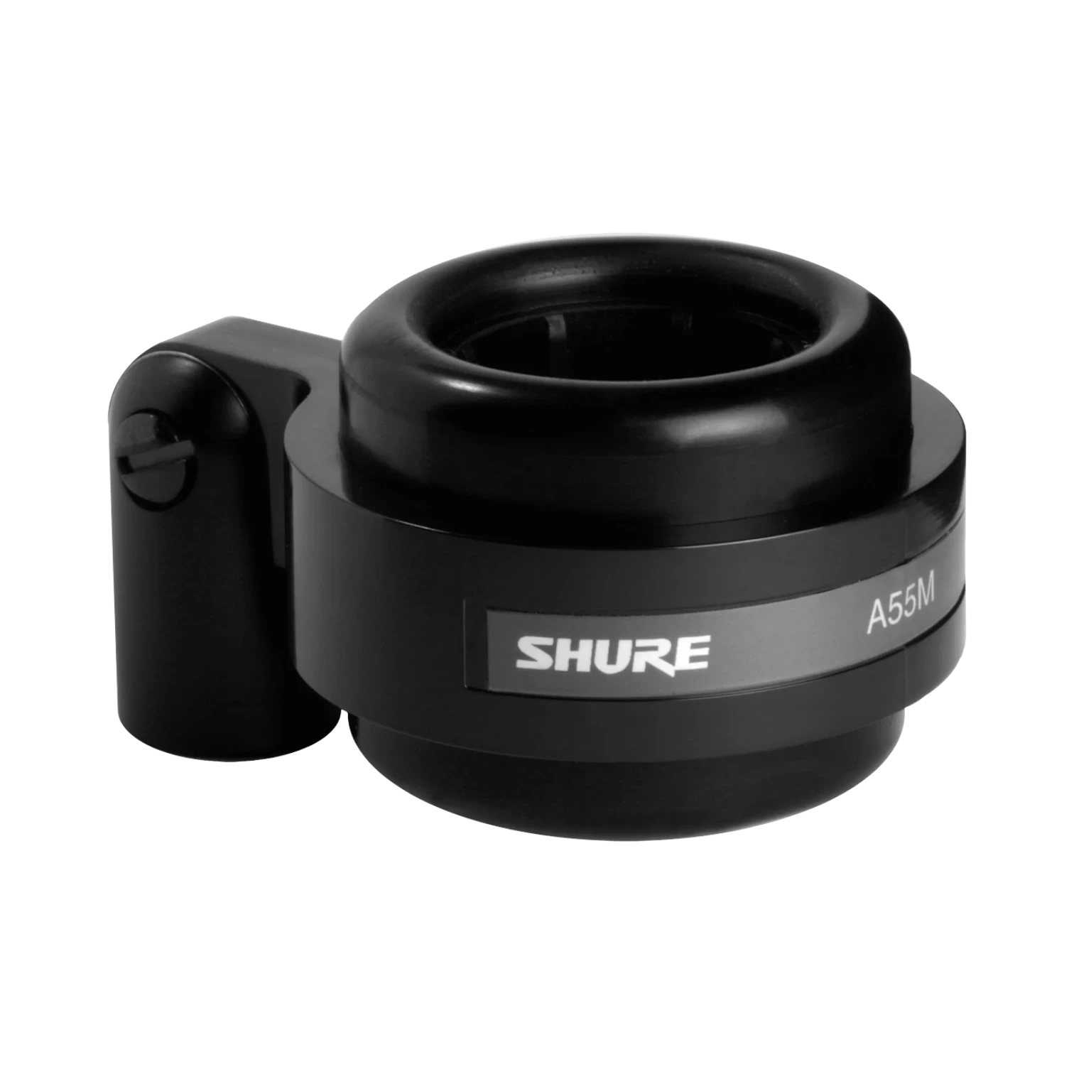 The Shure A55M is an isolation and swivel shock stopper microphone mount designed to reduce unwanted mechanical vibrations and stand noise for handheld microphones. It effectively cuts vibration by more than 20 decibels, ensuring a cleaner audio signal by preventing bumps and rumbles from reaching the microphone preamp. This mount fits microphones with barrels measuring 25 to 30 millimeters, making it compatible with popular Shure models like the SM57, SM58, and KSM109, as well as other brands with similar dimensions.