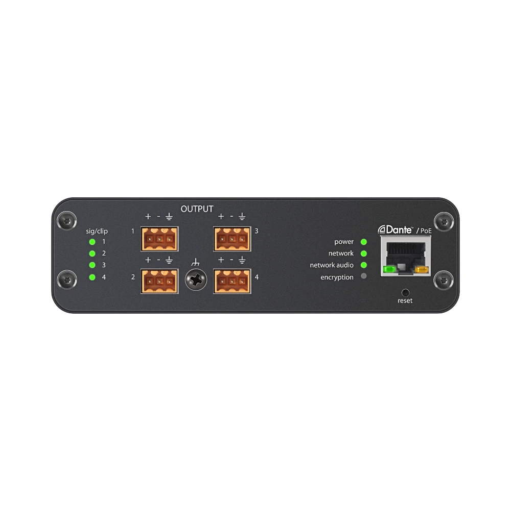 This interface connects directly to Dante audio networks through a single Ethernet port that carries audio, power, and control signals. The four analog outputs support both microphone and line-level signals, making it compatible with a wide range of professional audio equipment. Its control string compatibility with Crestron and AMX systems allows it to fit smoothly into automated environments, enhancing control and flexibility.