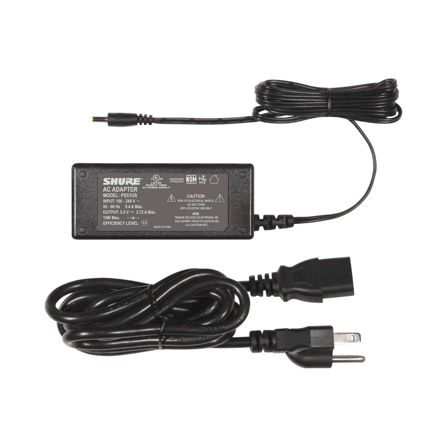 The Shure PS51US is a 5.5 V DC power adapter designed specifically for Shure two-bay battery chargers and other compatible devices with matching power requirements. It provides a reliable current of up to 2.72 amperes, ensuring your batteries charge fully and consistently without interruptions. With an input voltage range of 100 to 240 volts at 50 to 60 hertz, this adapter works seamlessly in various environments worldwide, from studios and control rooms to hotel suites.