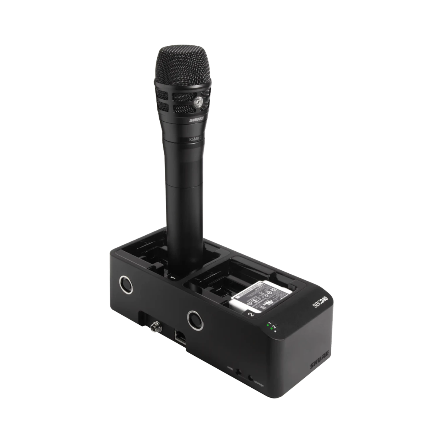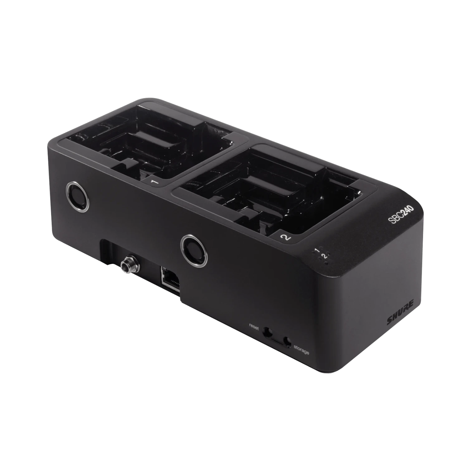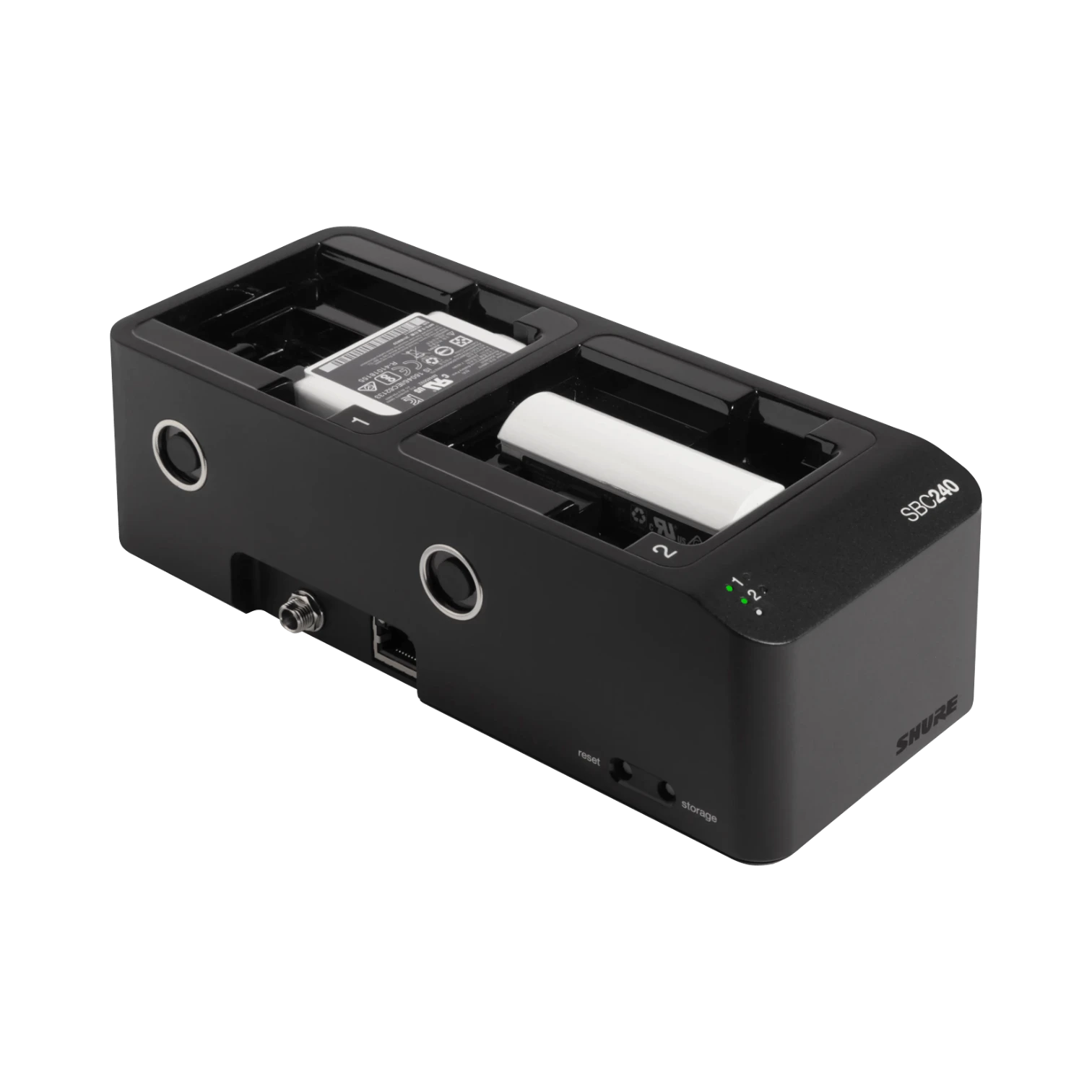 The Shure SBC240 is a two-bay networked docking charger designed to efficiently charge and store up to two Shure SB910 or SB920 batteries, or ADX1, ADX2, and ADX2FD transmitters. It provides remote monitoring capabilities through network connectivity, allowing users to track charging status and battery health via Shure’s Wireless Workbench software. This makes it an ideal solution for professional audio environments where managing multiple rechargeable devices is essential.
