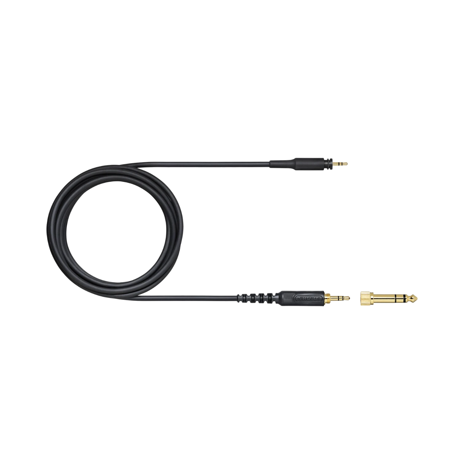 The SRH440A headphones connect via a detachable 3-meter coiled cable that locks securely with a bayonet mechanism, preventing accidental disconnections during use. The gold-plated 3.5 mm plug ensures a clean signal path and reduces corrosion, while the included 1/4" adapter expands compatibility to professional audio interfaces, mixers, and amplifiers. This makes the headphones a versatile choice for a variety of studio and field setups.