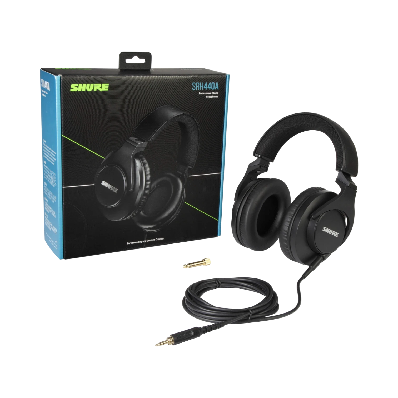 The Shure SRH440A is a pair of closed-back, over-ear studio headphones designed to provide clear and accurate sound for monitoring, recording, and detailed audio review. Featuring 40 mm dynamic drivers and a frequency response from 10 Hz to 22 kHz, these headphones reveal subtle details across a wide audio spectrum. Their circumaural design helps reduce ambient noise, making them suitable for focused listening in both studio and field environments.