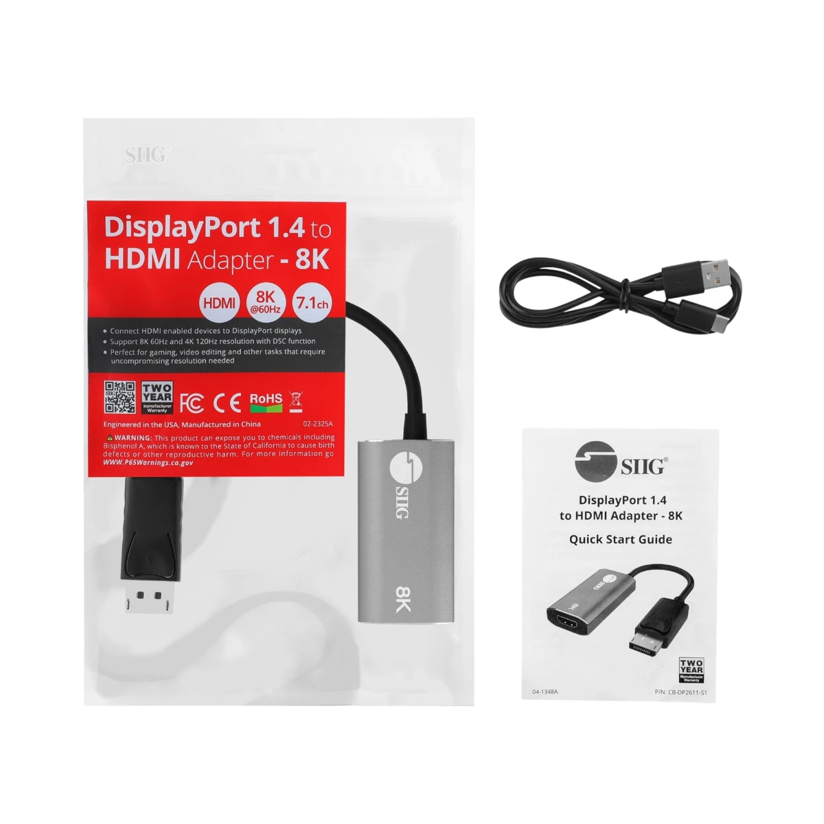 The SIIG CB-DP2611-S1 is an adapter that converts a DisplayPort 1.4 output into an HDMI input, enabling connection to 8K or high-refresh-rate 4K displays. It supports resolutions up to 8K at 60 Hz and 4K at 120 Hz with HDR, making it suitable for users who need high-quality video output from their computers or graphics cards. The adapter is unidirectional, sending signals only from DisplayPort to HDMI, which simplifies setup and ensures reliable performance.