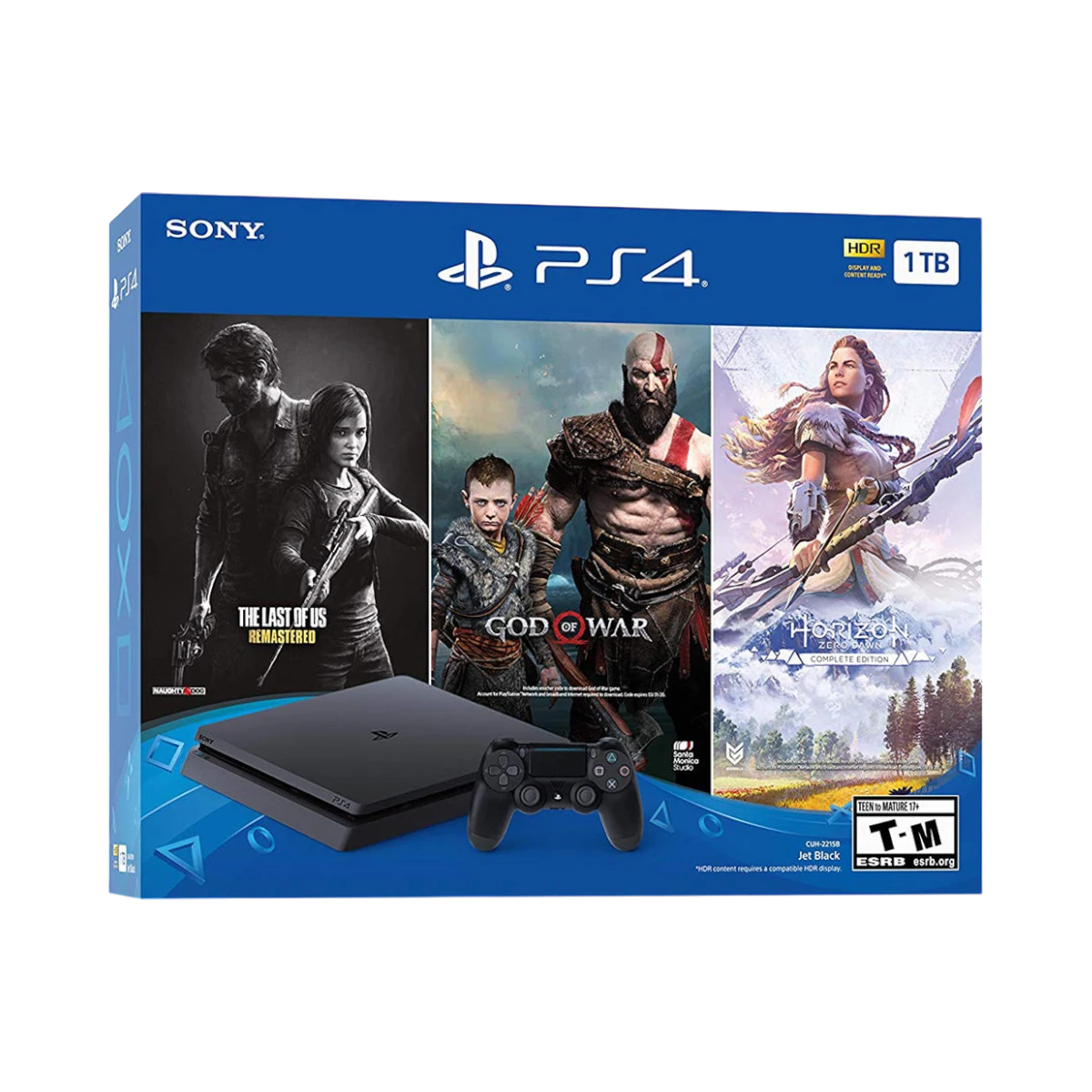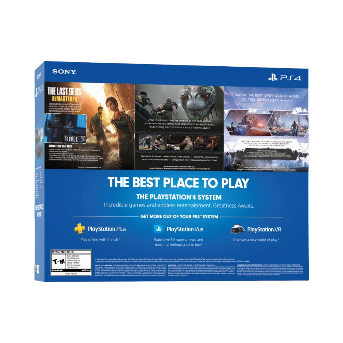 This bundle includes a DualShock 4 wireless controller and three popular PlayStation titles: The Last of Us: Remastered on disc, plus digital download codes for God of War and Horizon Zero Dawn: Complete Edition. High Dynamic Range (HDR) support enhances visuals on compatible TVs, making games and media appear more vivid and lifelike.