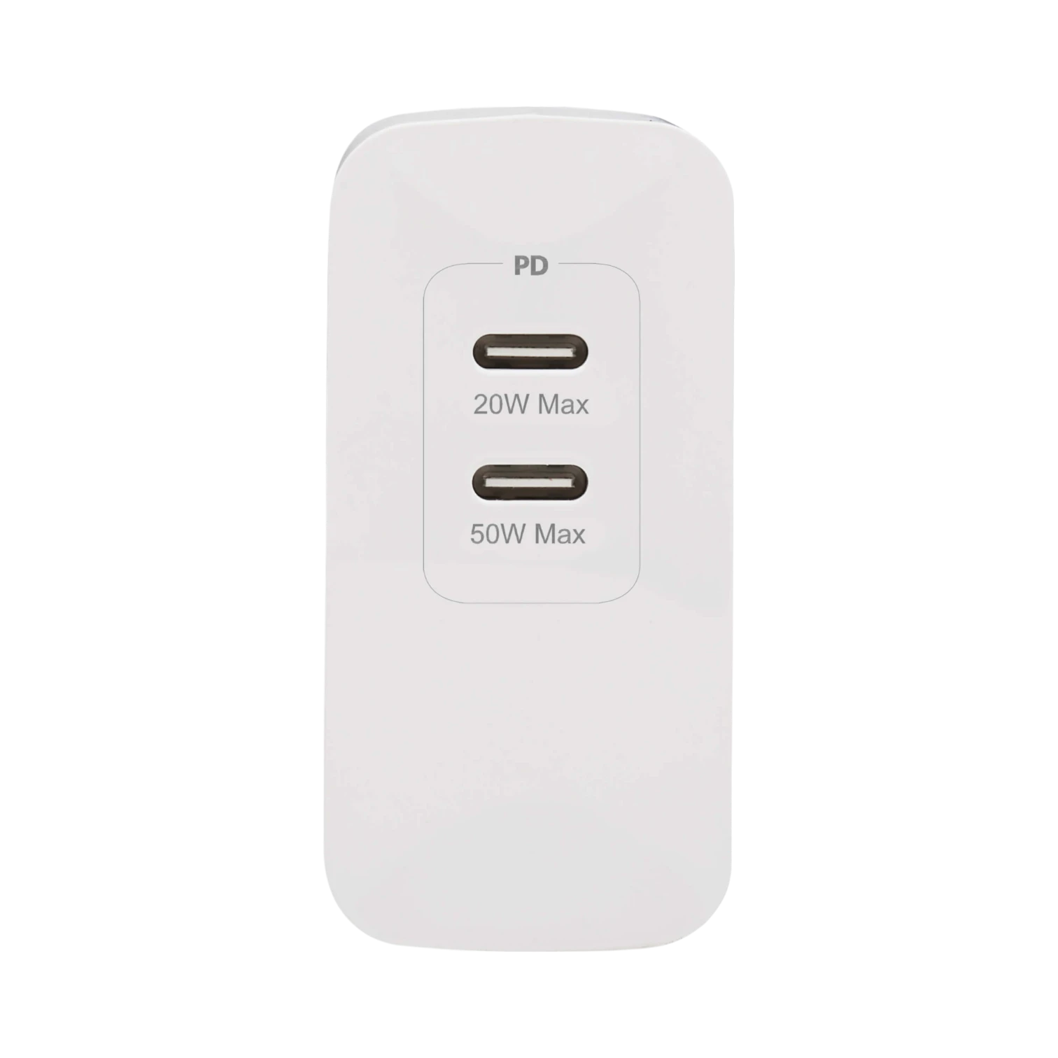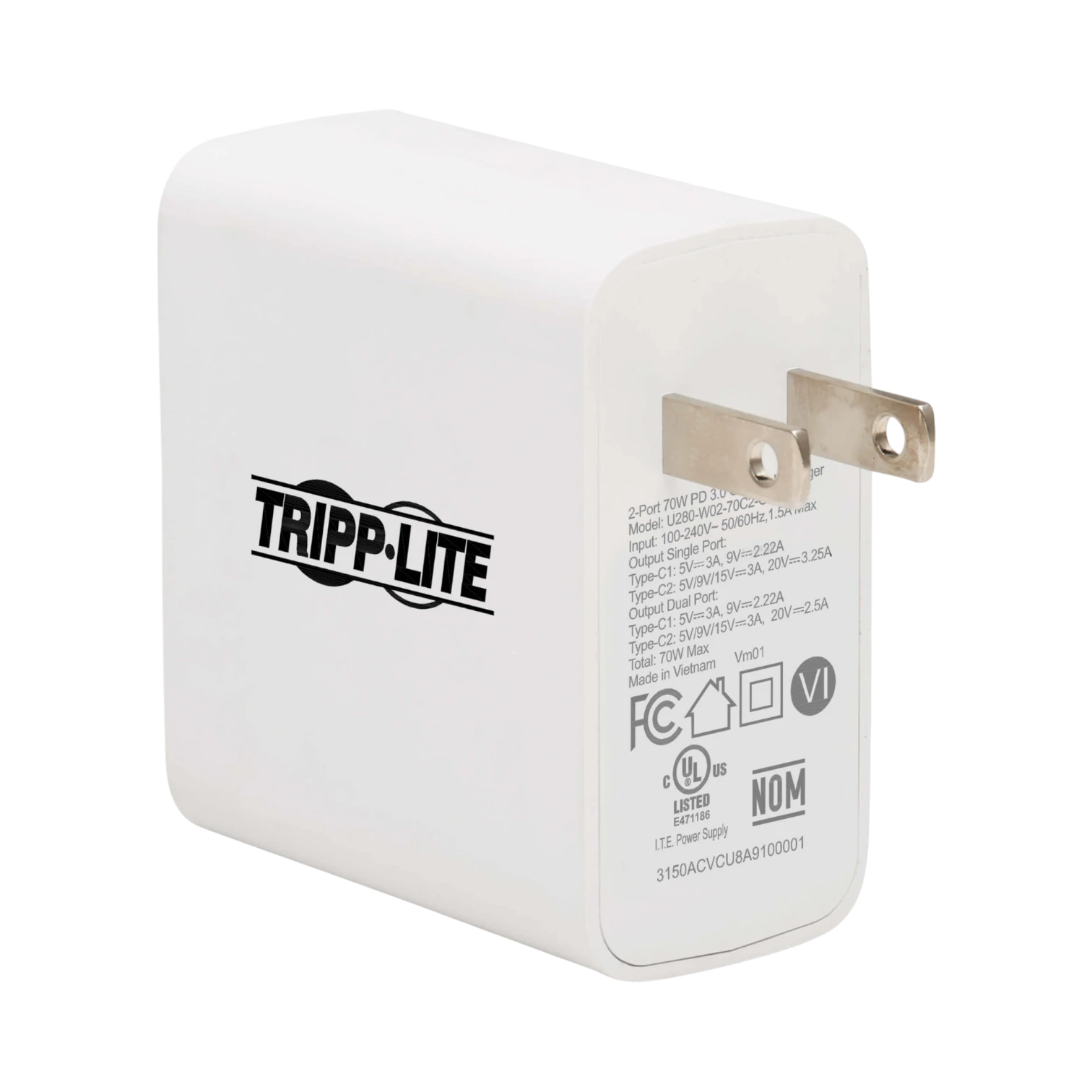 The Tripp Lite U280-W02-70C2-G is a dual-port USB-C wall charger designed to provide fast and efficient charging for multiple devices simultaneously. With a total power output of 70 watts delivered through two USB-C Power Delivery 3.0 ports, it can charge a laptop and a smartphone at the same time without compromising speed. Its Gallium Nitride (GaN) technology enables a compact and lightweight design that runs cooler than traditional chargers, making it ideal for both home and travel use.