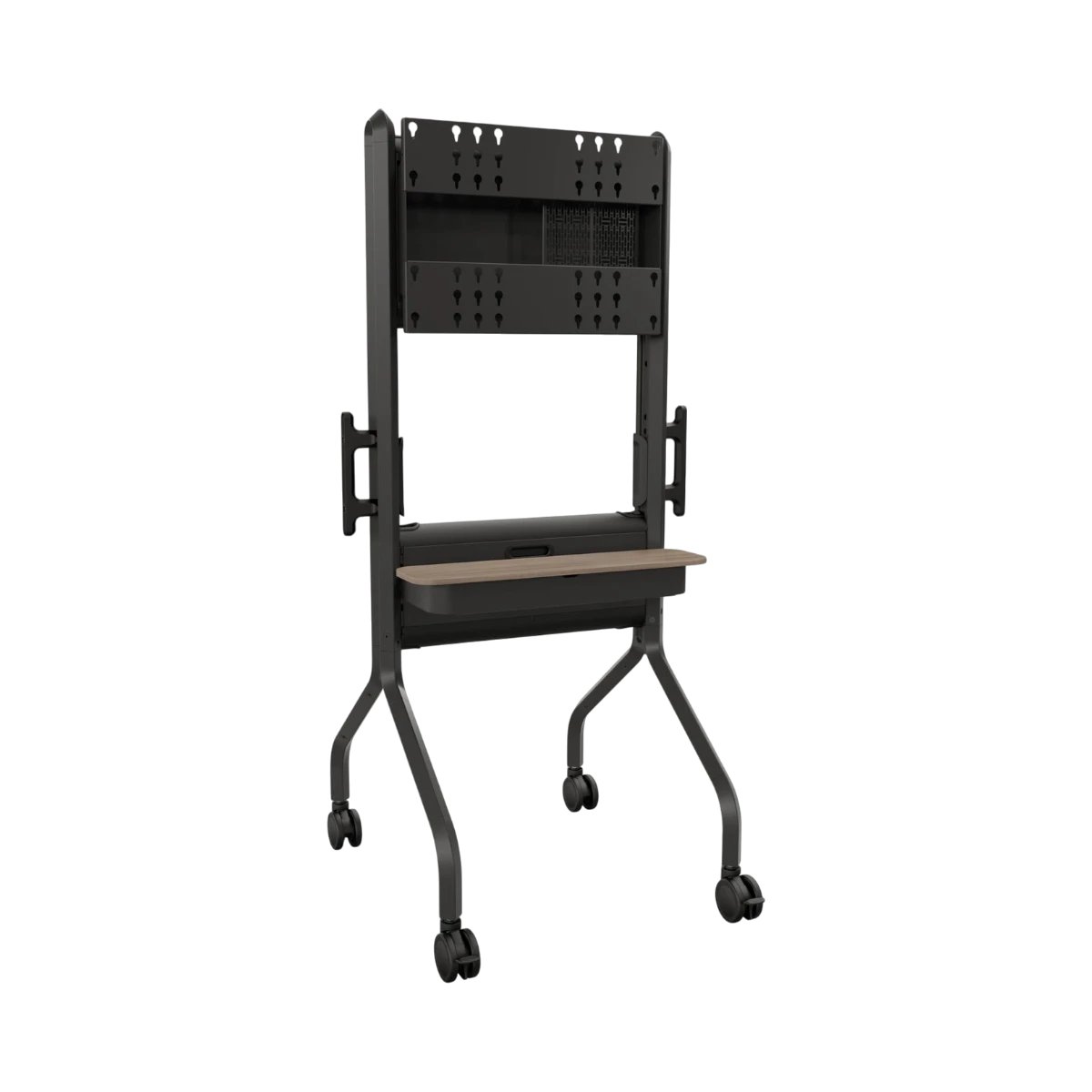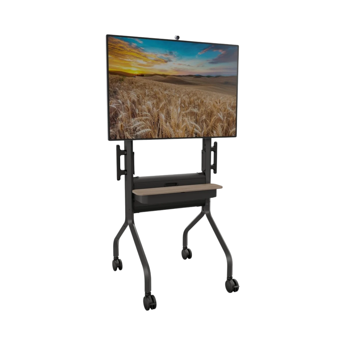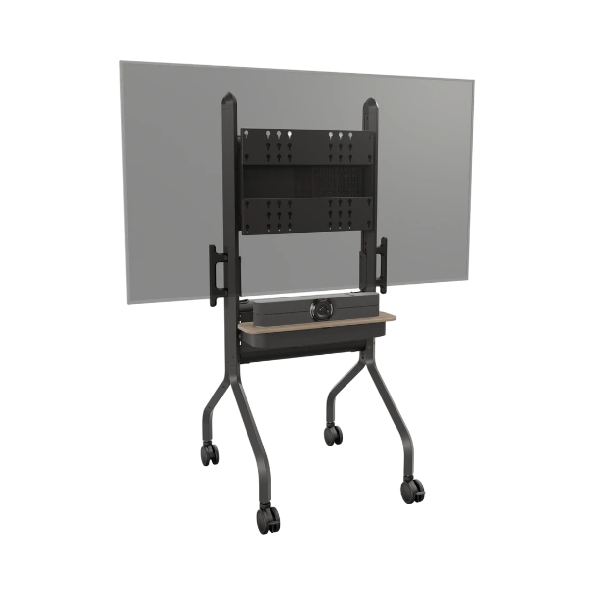 The Voyager cart is designed to support a variety of AV setups by providing mounts for cameras and speakers, which is especially useful for video conferencing platforms like Zoom and Microsoft Teams. Its VESA mounting compatibility ensures it works with most large flat panel displays, making it a flexible choice for different brands and models.
