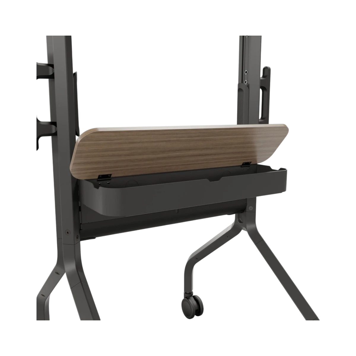 Its design includes integrated storage with lockable panels to secure components, built-in cable management to keep wires tidy, and mounts for cameras and speakers, making it well suited for video conferencing environments. Smooth-rolling casters and lockable rear wheels enhance mobility and stability, while the compact footprint and accessible handles allow easy navigation in tight spaces.
