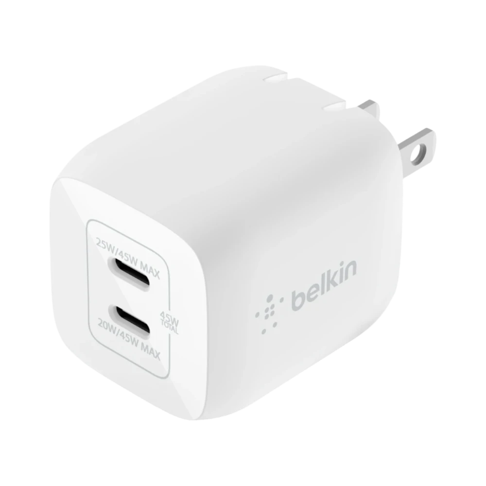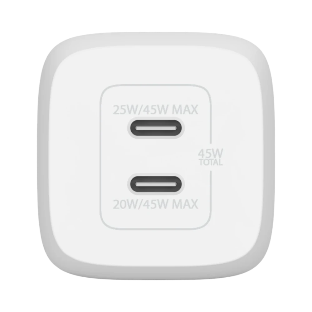The Belkin WCH011DQWH is a dual USB-C charger designed to deliver up to 45 watts of power using advanced GaN technology. It features two USB-C ports that provide 25 watts and 20 watts respectively, allowing you to charge two devices simultaneously. Supporting PD 3.0 and PPS fast charging standards, this charger adapts its power output to suit smartphones, tablets, or laptops, ensuring efficient and safe charging. Its compact design with a foldable Type A plug makes it highly portable for travel or daily use.