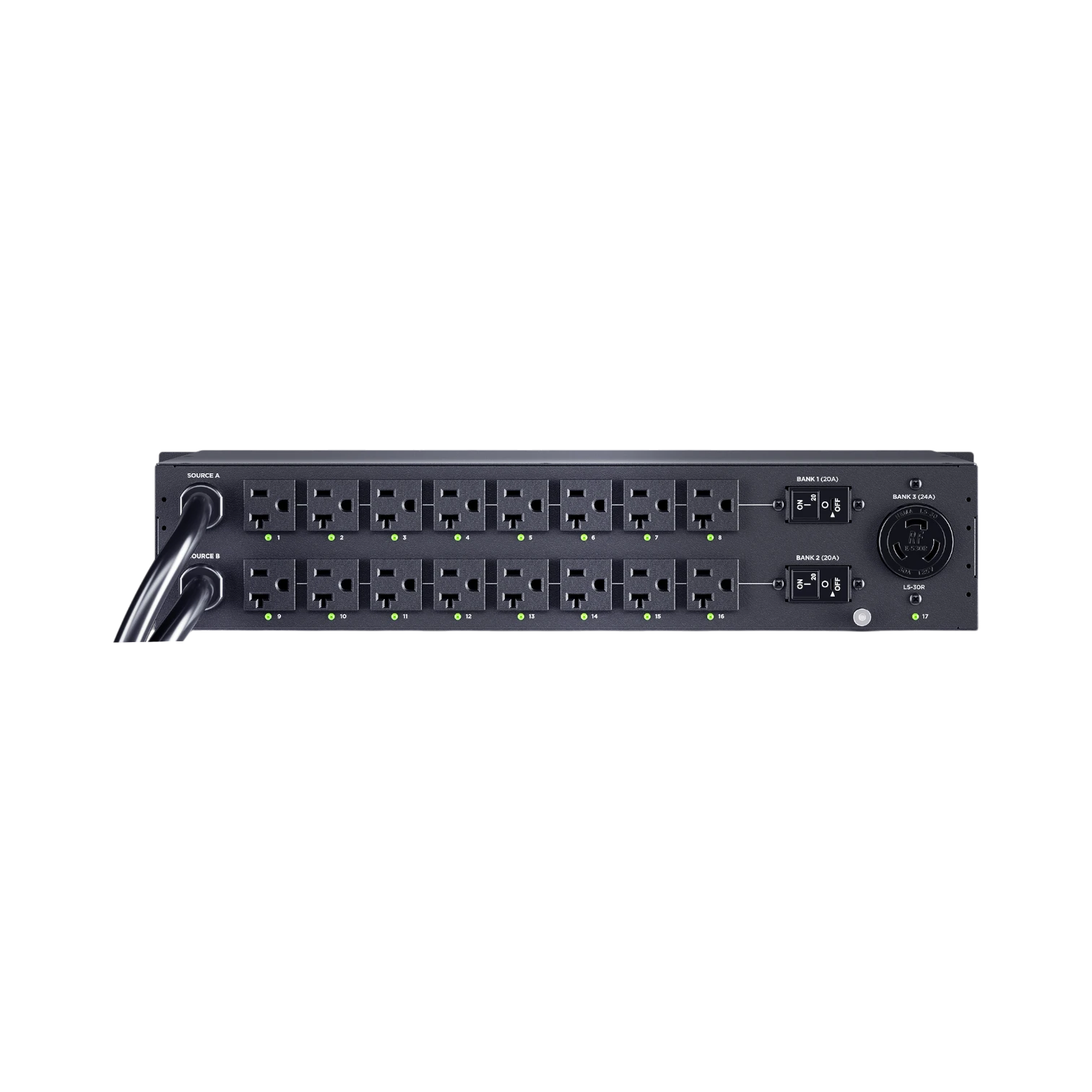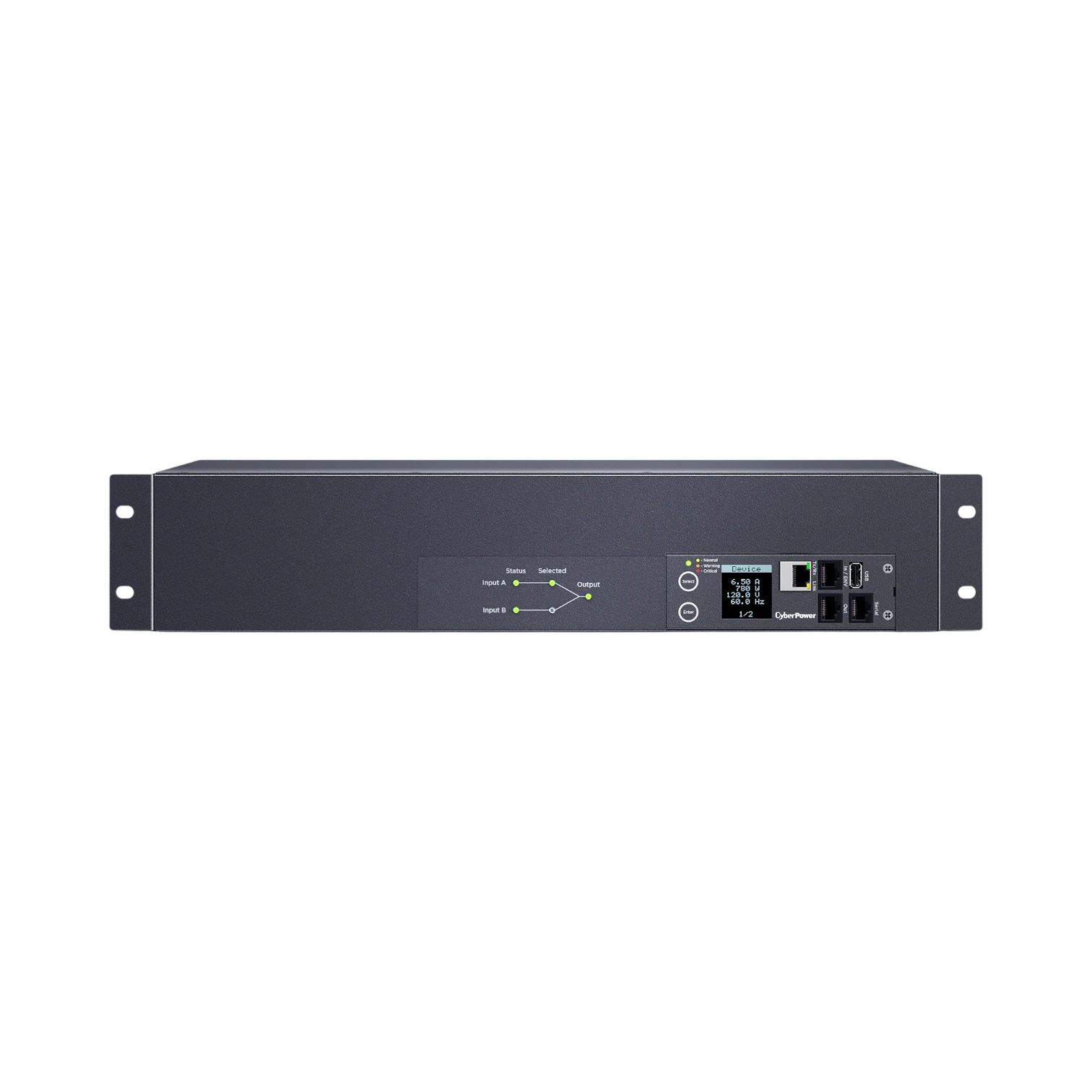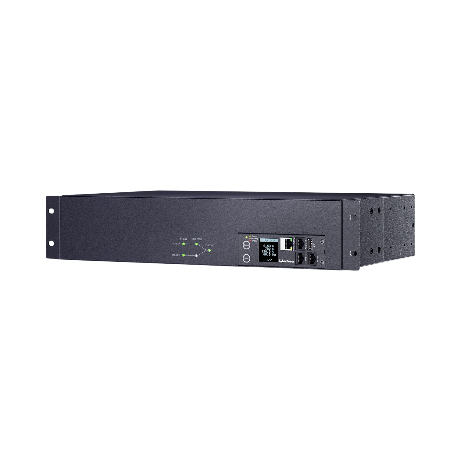 The CyberPower PDU44003 is a switched automatic transfer switch power distribution unit designed to maintain continuous power for critical equipment in environments such as data centers and network closets. It features dual NEMA L5-30P power inputs that automatically switch in under 10 milliseconds to prevent downtime, ensuring your devices remain powered without interruption. With 16 NEMA 5-20R outlets and one NEMA L5-30R outlet, it supports a wide range of devices while providing real-time monitoring through a built-in LCD screen.