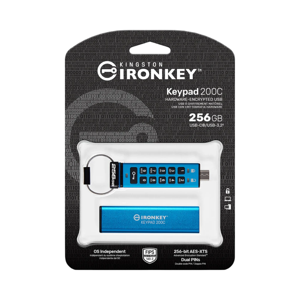 The Kingston IKKP200C/256GB is a secure USB flash drive designed to protect sensitive data with 256GB of storage and hardware-based XTS-AES 256-bit encryption. It features a built-in alphanumeric keypad for PIN access directly on the device, eliminating the need for software or computer-based unlocking. Certified to FIPS 140-3 Level 3 standards, this drive offers military-grade security combined with fast USB-C 3.2 Gen 1 transfer speeds, making it suitable for professionals who require both strong protection and efficient data handling.