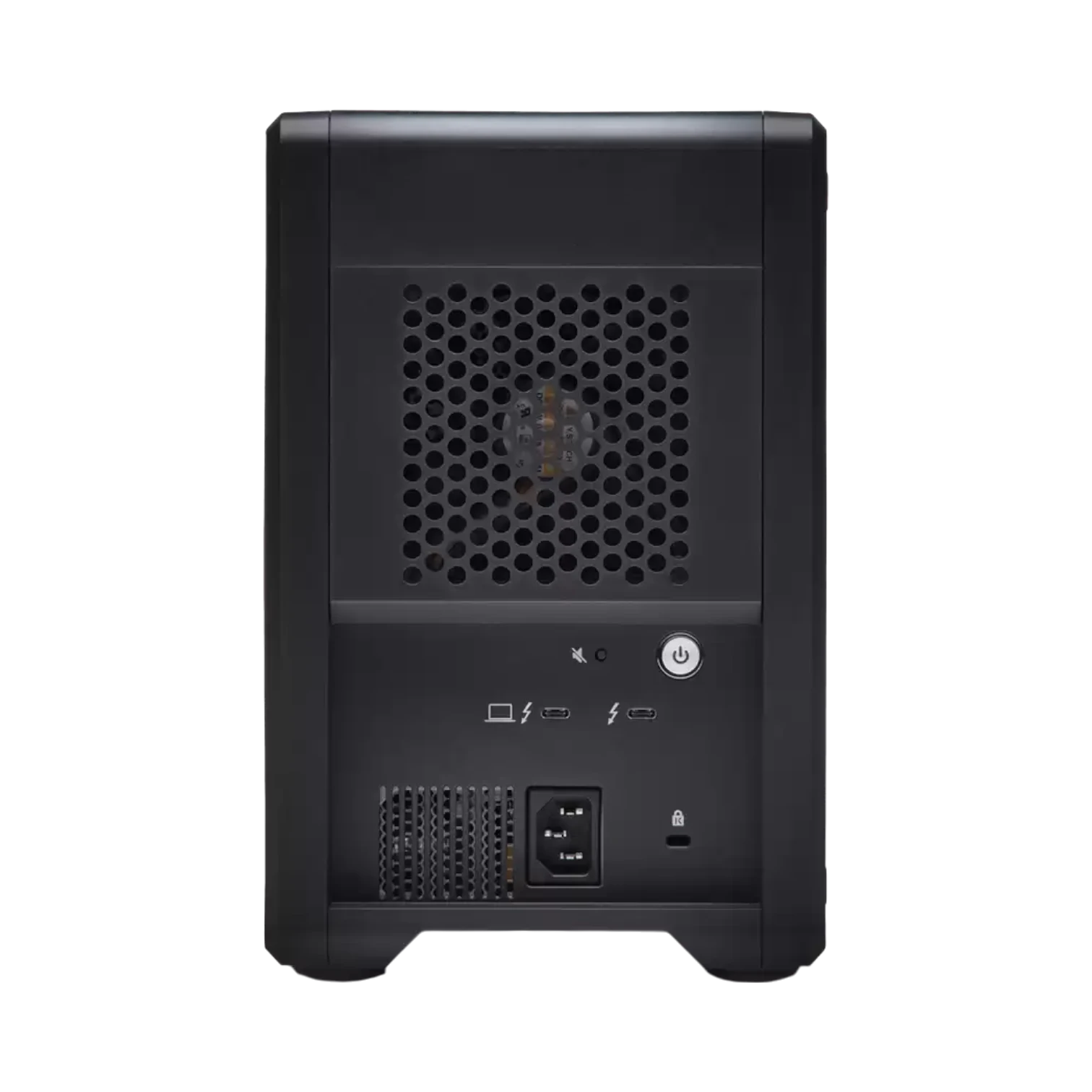 The G-RAID Shuttle 4 offers dual Thunderbolt 3 ports that provide high-speed data transfer and allow daisy-chaining multiple devices, which is ideal for expanding storage in professional setups. The USB-C interface adds flexibility for connecting to a variety of modern computers and peripherals. This combination ensures compatibility with the latest Mac systems and Windows PCs after reformatting, making it a versatile choice for mixed environments.