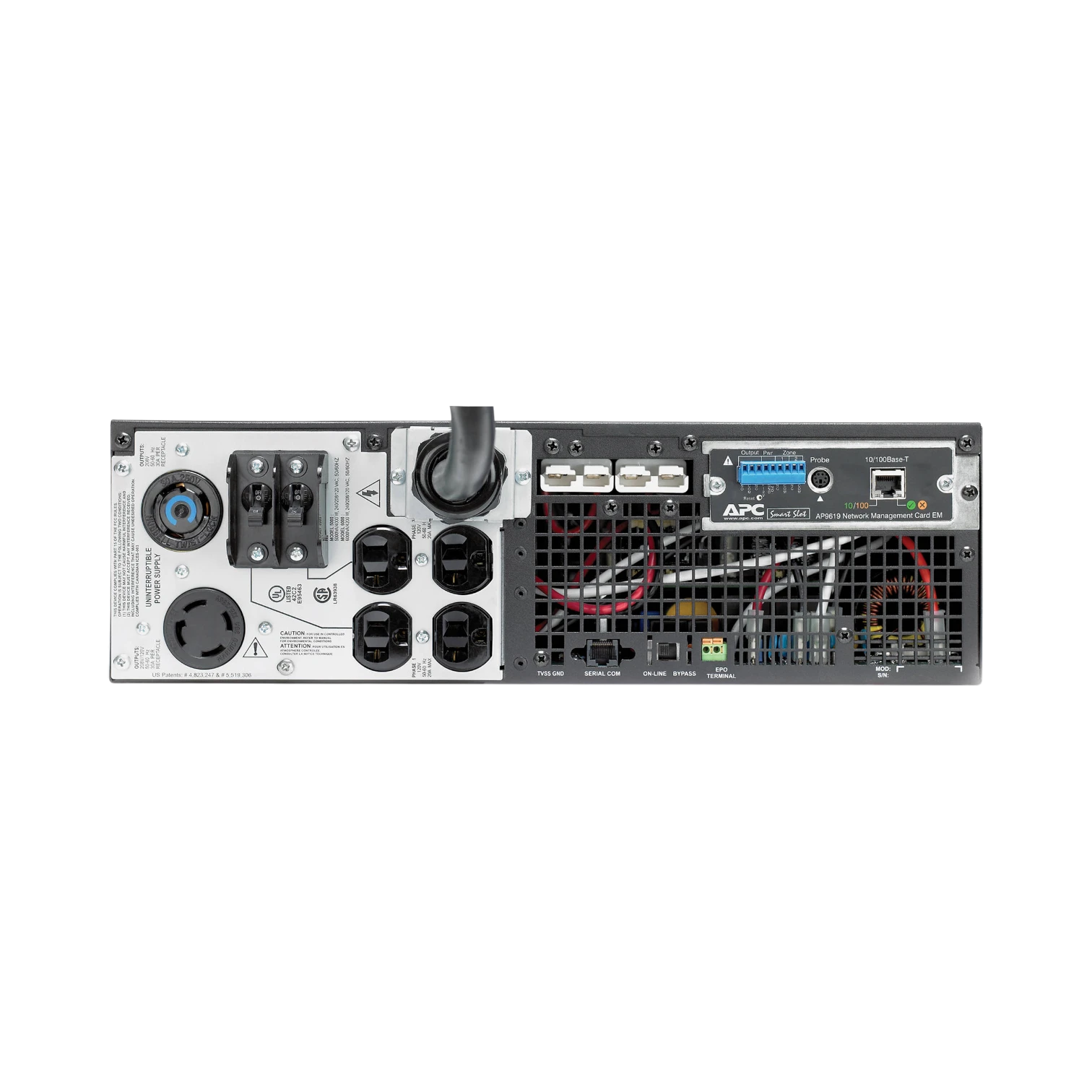 This UPS supports a range of devices through its multiple NEMA outlets, accommodating both standard and higher-power equipment. The inclusion of L6-30R and L14-30R outlets allows connection to devices requiring 208V or 240V power, while the 5-20R outlets serve typical 120V equipment. Network management capabilities make it compatible with remote monitoring systems, allowing IT teams to oversee power status and perform control functions without physical access.