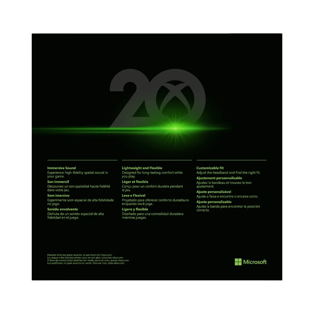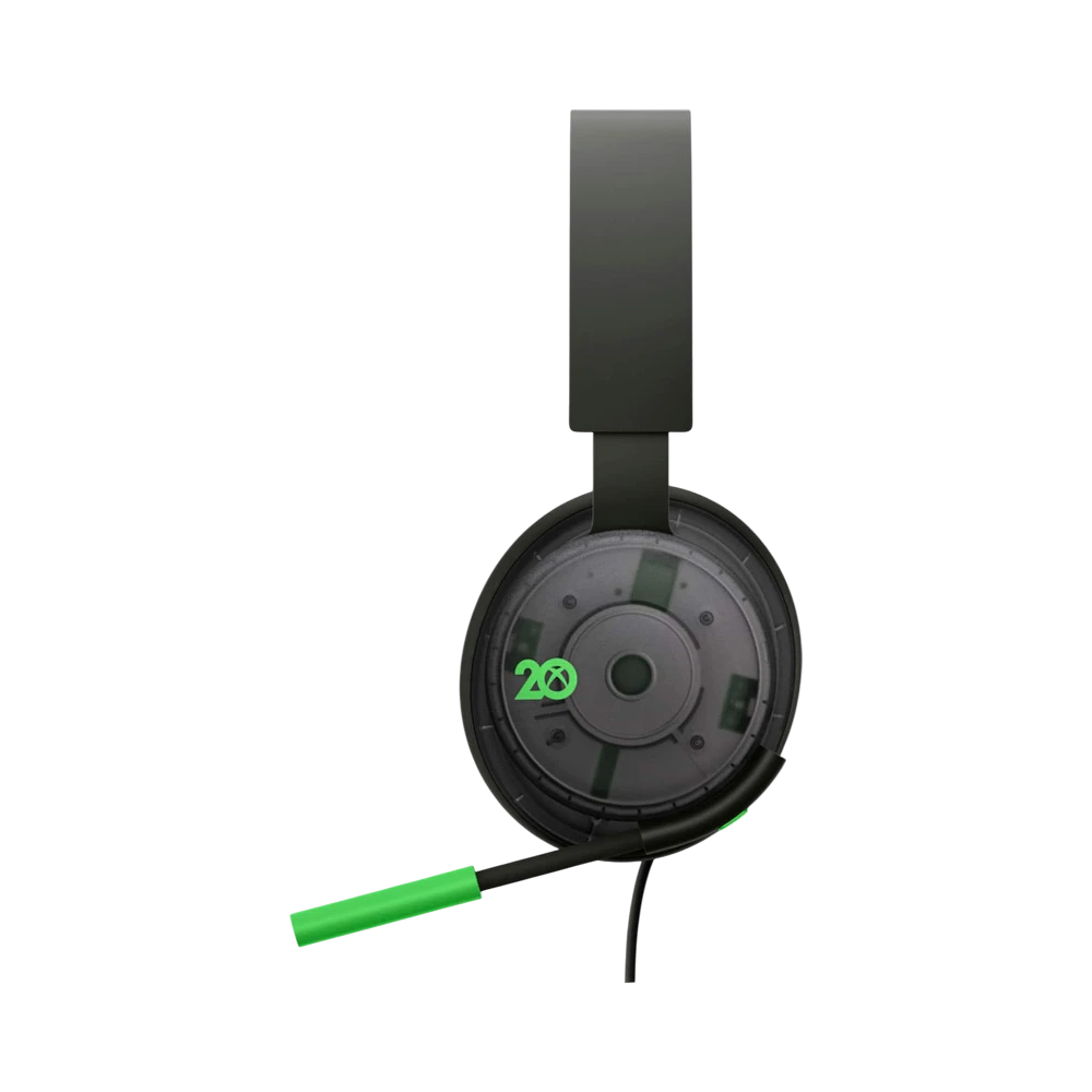 The Microsoft 8LI-00008 is a 20th Anniversary Special Edition stereo gaming headset that celebrates two decades of Xbox with a classic black design accented by green highlights reminiscent of the original console. It delivers immersive audio through spatial sound support including Windows Sonic, Dolby Atmos, and DTS Headphone: X, while providing comfort for extended gaming sessions with ultra-soft over-the-ear cushions and a lightweight adjustable headband. The wired 3.5mm connection ensures easy compatibility with Xbox Series X|S, Xbox One controllers, and Windows PCs without the need for batteries.