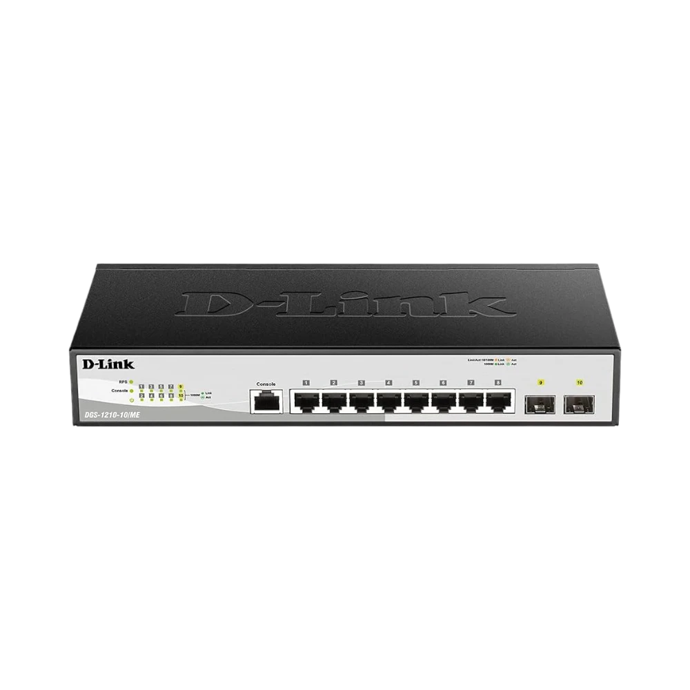 The D-Link DGS-1210-10/ME is a 10-port managed Ethernet switch designed to deliver reliable and high-speed connectivity for demanding network environments. It features eight RJ-45 ports supporting speeds up to 1 Gbps and two SFP ports for fiber connections, enabling network extension over longer distances. This switch is tailored for businesses and service providers requiring secure, manageable, and scalable network infrastructure with advanced Layer 2 capabilities.