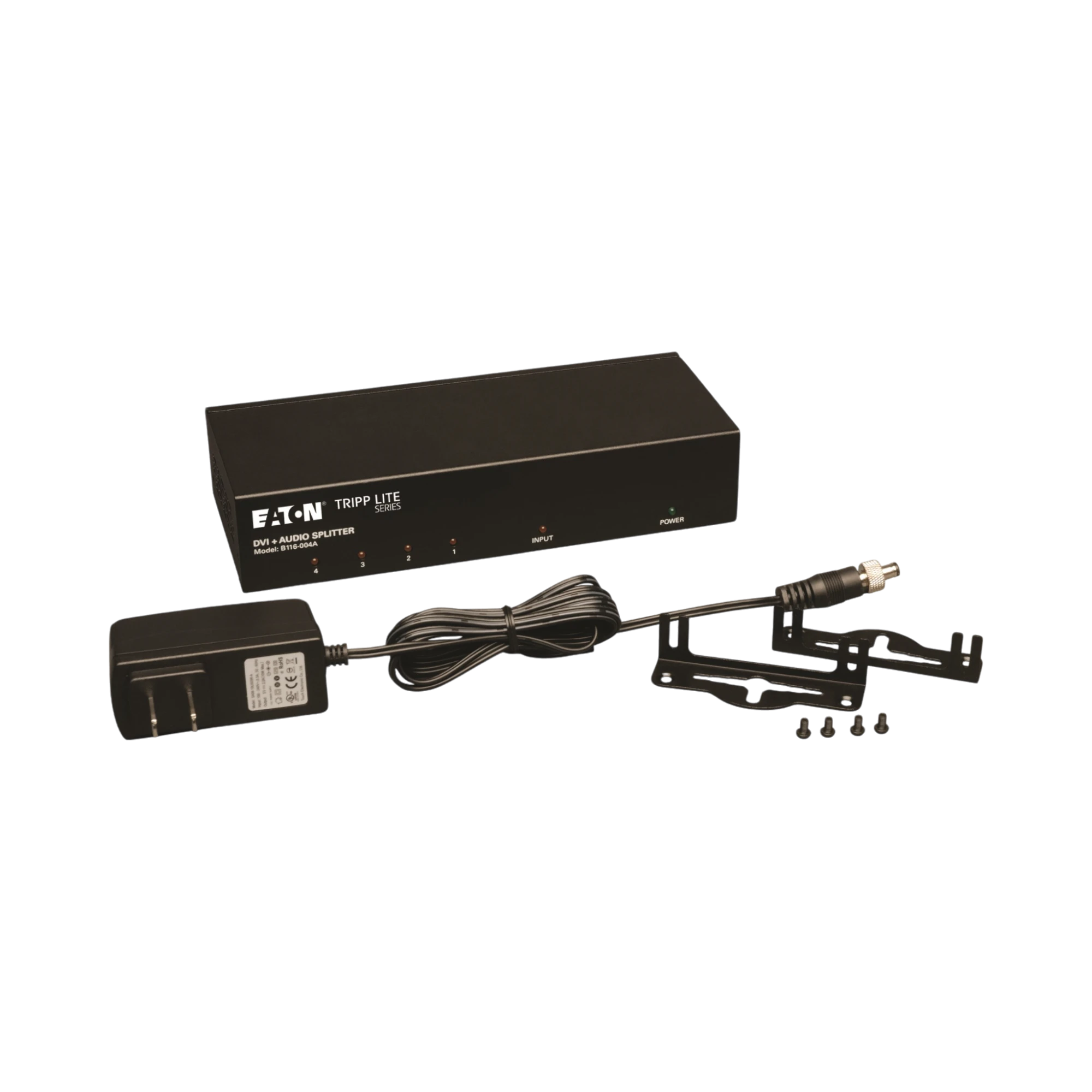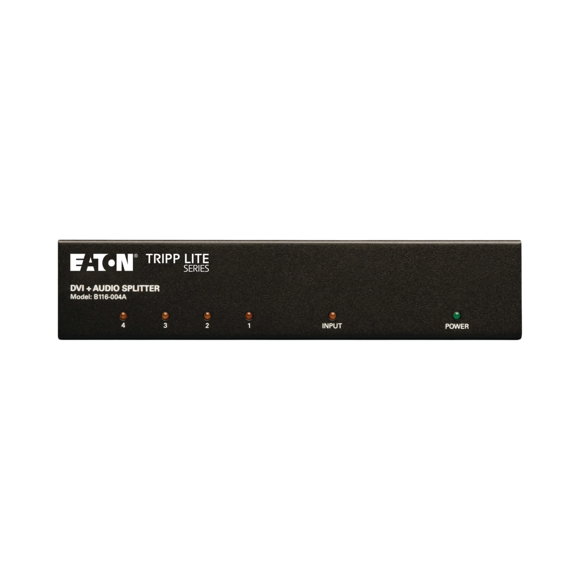The Tripp Lite B116-004A is a 4-port DVI splitter designed to distribute high-definition video and audio from a single DVI source to four separate DVI displays simultaneously. It supports resolutions up to 1920 x 1200 at 60 Hz, including full 1080p HD, ensuring sharp and consistent visuals across multiple screens. This device is ideal for settings such as classrooms, offices, restaurants, and trade shows where clear and reliable video distribution is essential.