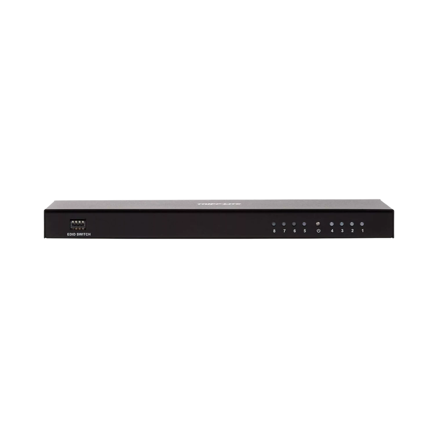 The Tripp Lite B118-008-UHD is an eight-port HDMI splitter designed to distribute a single Ultra High Definition video signal to eight separate displays simultaneously. It supports a crisp 3840 x 2160 resolution at 30 Hz, making it suitable for environments like home theaters, classrooms, or retail spaces where consistent, high-quality video output is essential across multiple screens. This device ensures both video and audio maintain their full fidelity, supporting advanced formats and protected content without interruption.