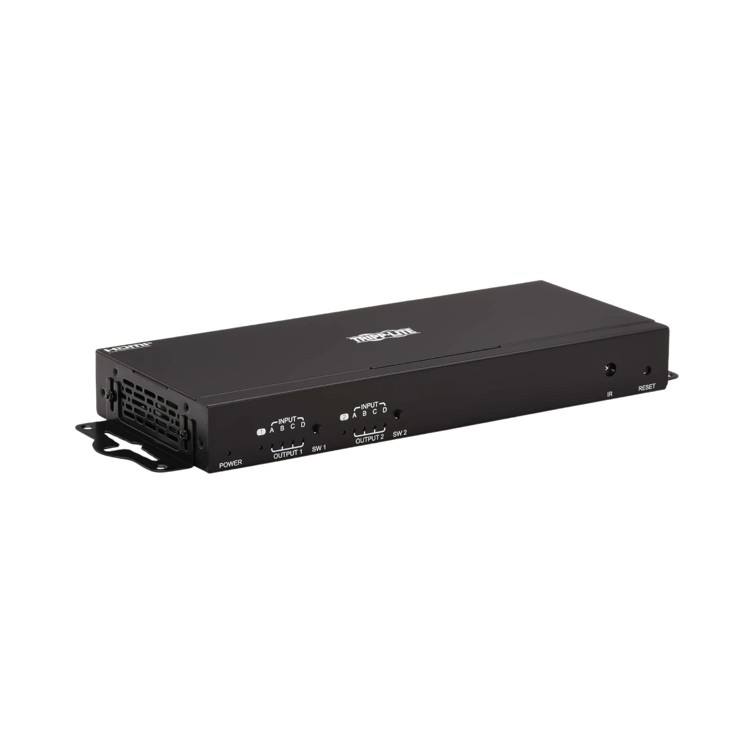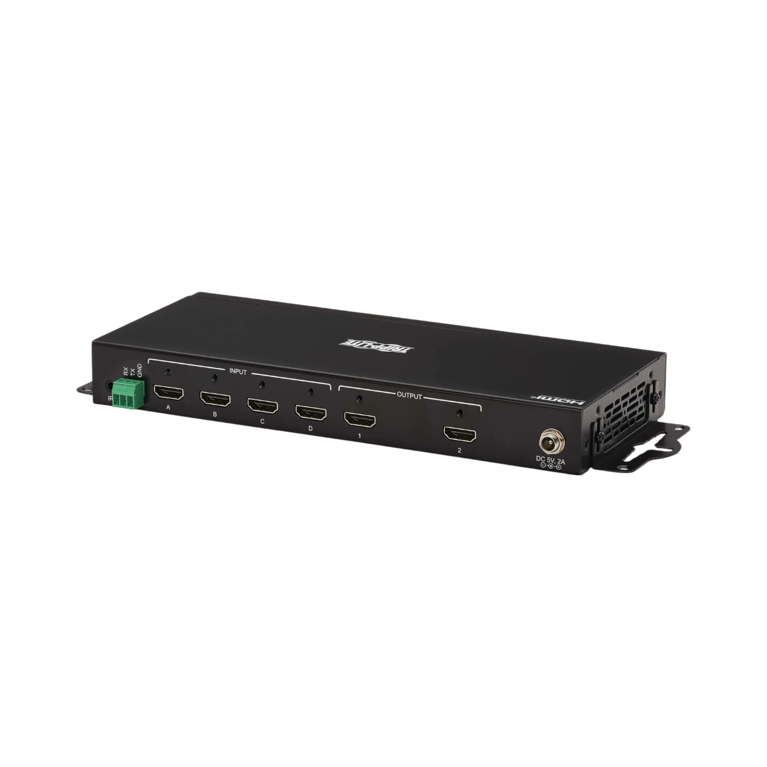 - Routes four HDMI inputs to two independent HDMI outputs, allowing flexible source-to-display combinations