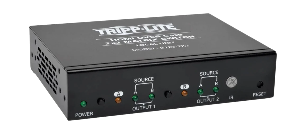 The Tripp Lite B126-2X2 is an HDMI over Cat5/6 matrix splitter switch designed to transmit video and audio signals from two HDMI sources to two separate displays up to 125 feet away. It converts HDMI signals for transmission over standard network cabling, allowing flexible placement of source devices and displays without compromising Full HD 1080p resolution and stereo audio quality. This solution is ideal for environments where source equipment cannot be placed near screens, such as conference rooms, trade show booths, classrooms, and retail signage.