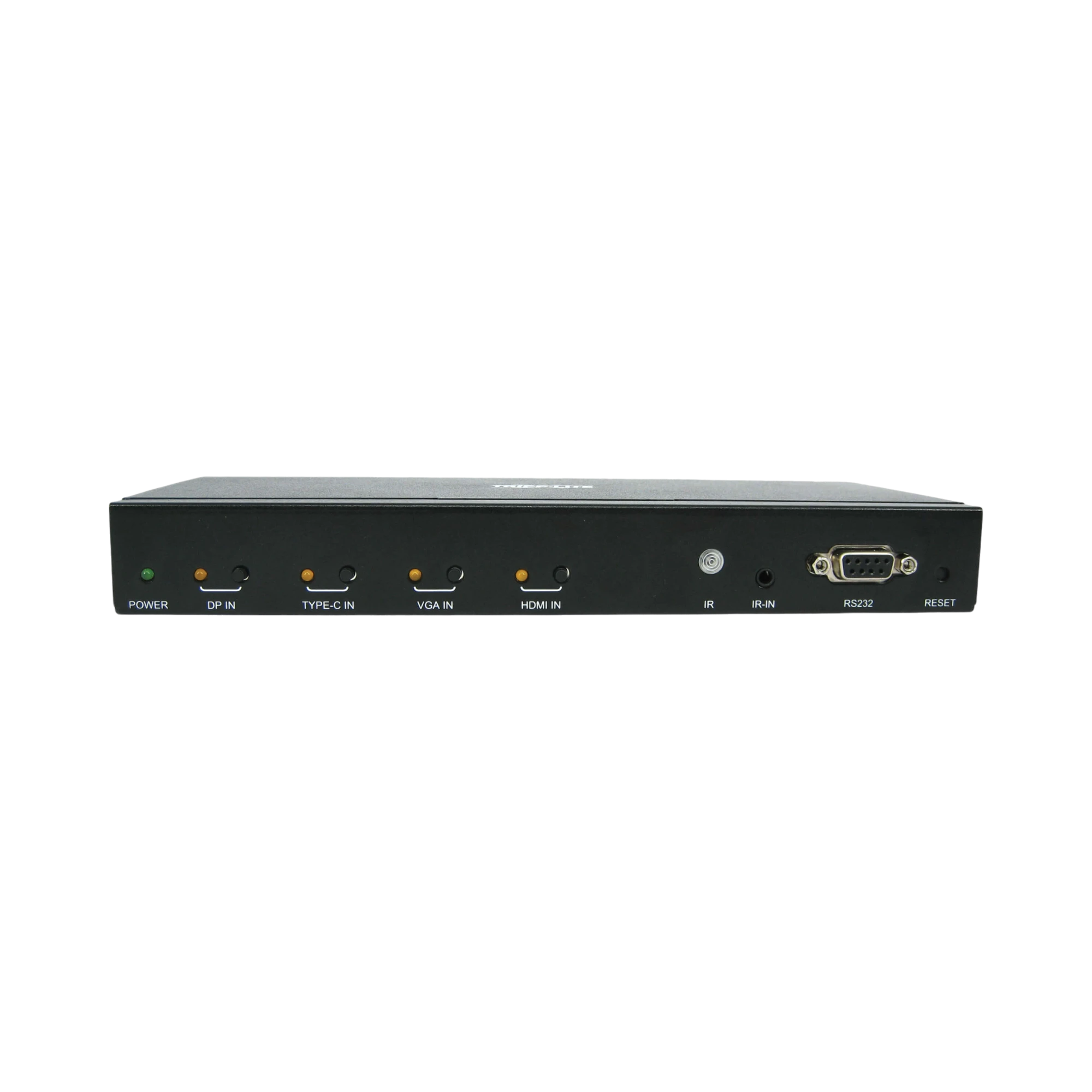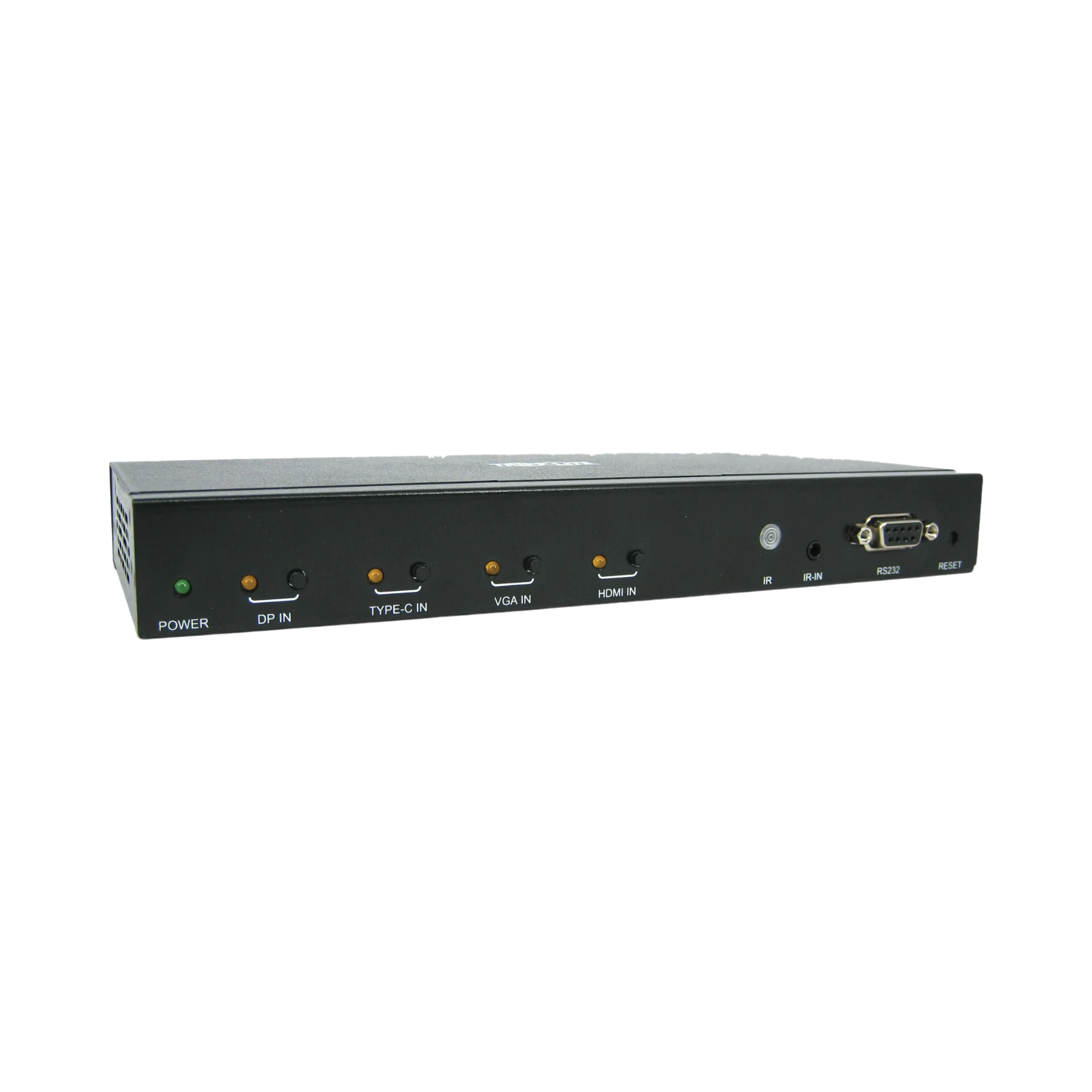- Control options: front panel buttons, IR remote, RS-232 commands