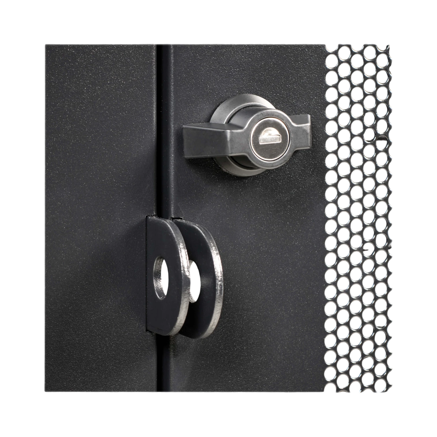 - Heavy-duty steel construction with locking doors on both front and rear for enhanced security