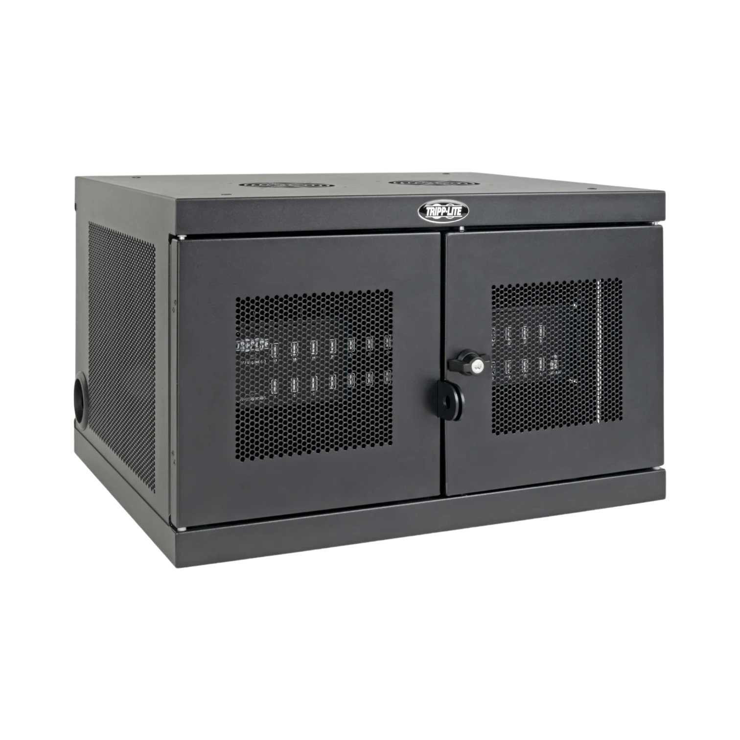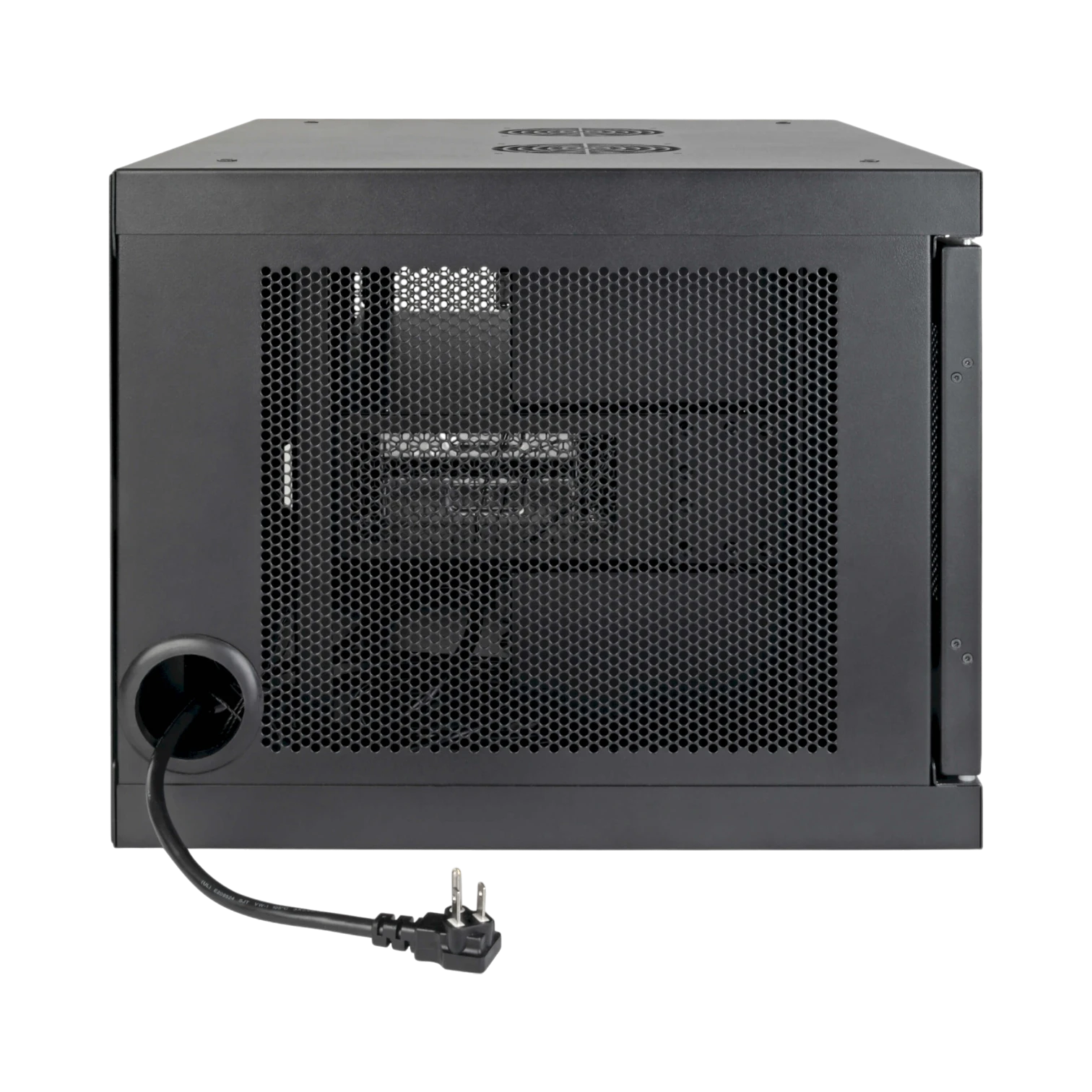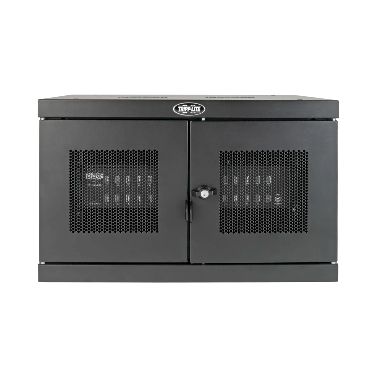 Its steel enclosure features a three-point locking system with an additional hasp for a padlock, providing robust security. The cabinet’s split front doors open fully to 180 degrees, allowing easy access to devices without tight clearances. Flow-through ventilation prevents overheating during charging, and the detachable 10-foot power cord with a right-angle NEMA 5-15P plug offers flexible placement options for wall mounting or desktop use.