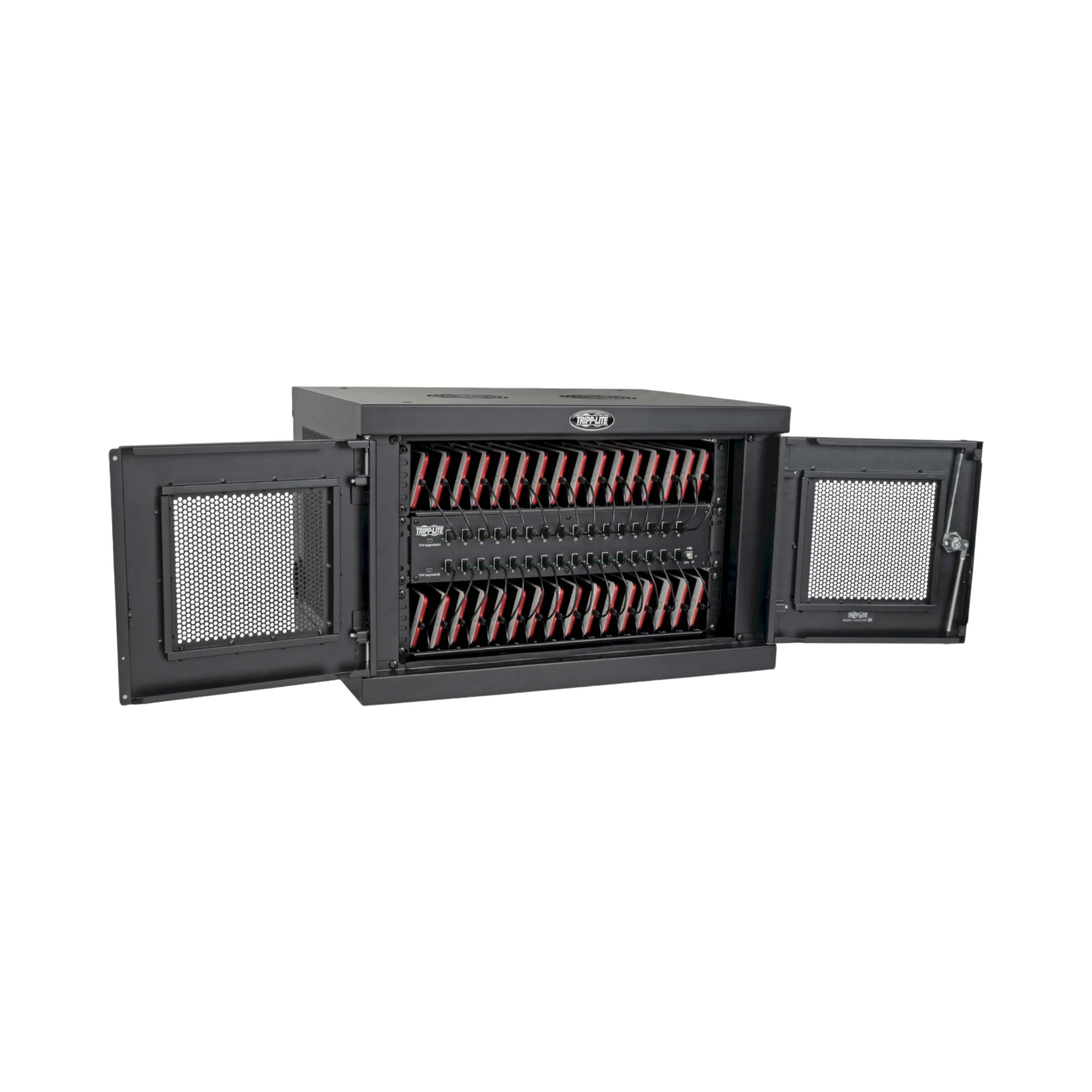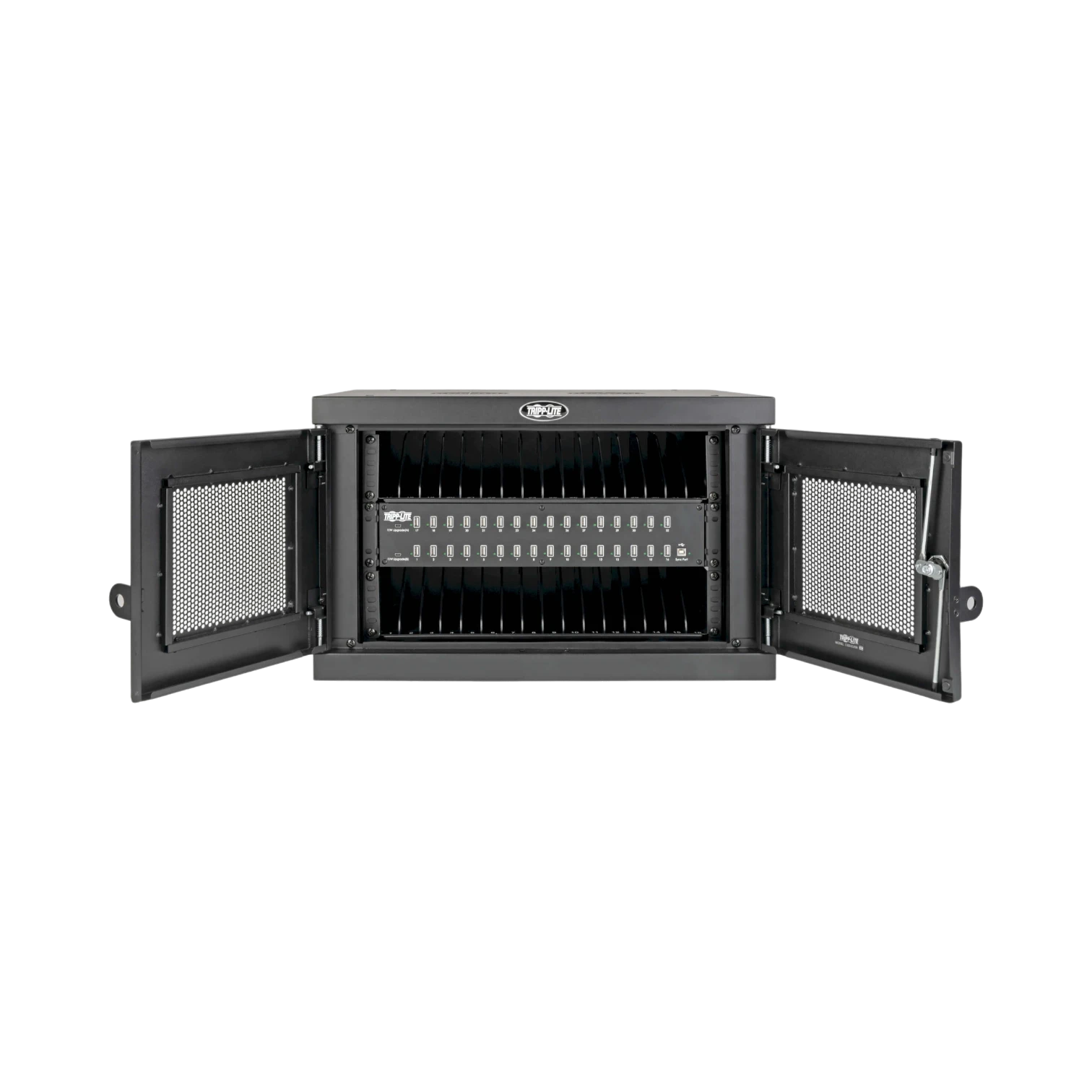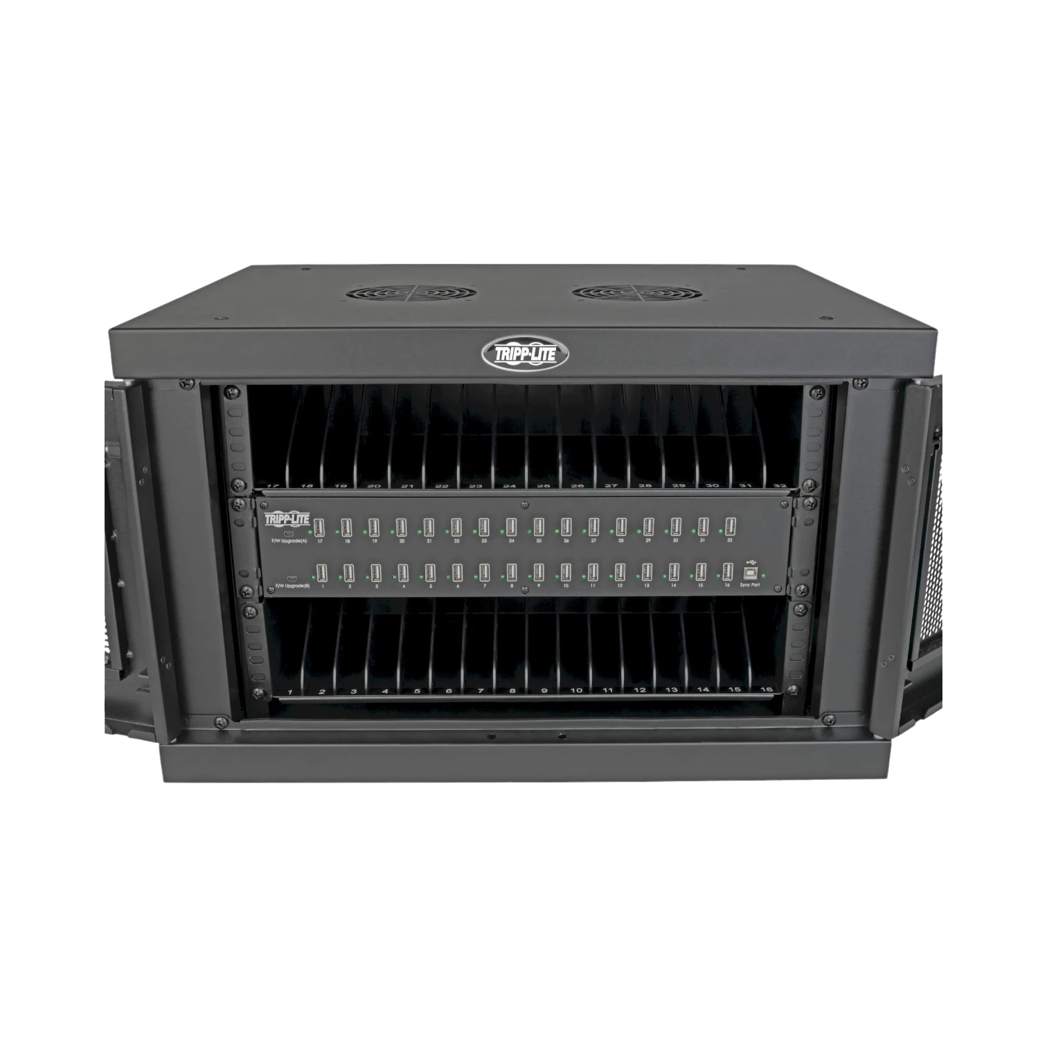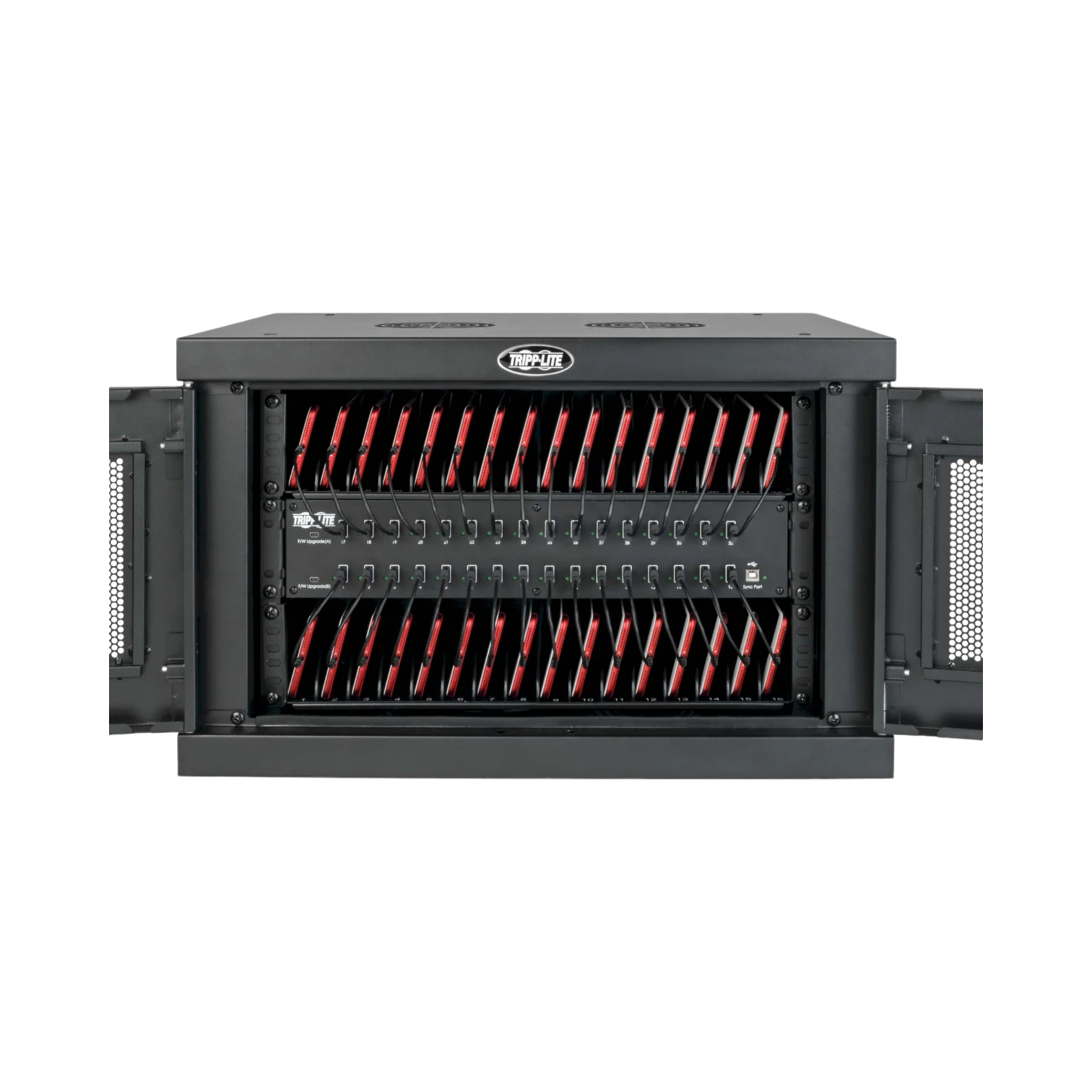 The Tripp Lite CSD32USB is a locking charging station designed to securely charge and sync up to 32 smartphones or small USB devices simultaneously. Each USB port delivers up to 2.4 amps, ensuring fast and efficient charging for devices such as handsets, scanners, and wearables. This station is ideal for environments where managing multiple devices is critical, including corporate fleets, healthcare, retail, and industrial settings.