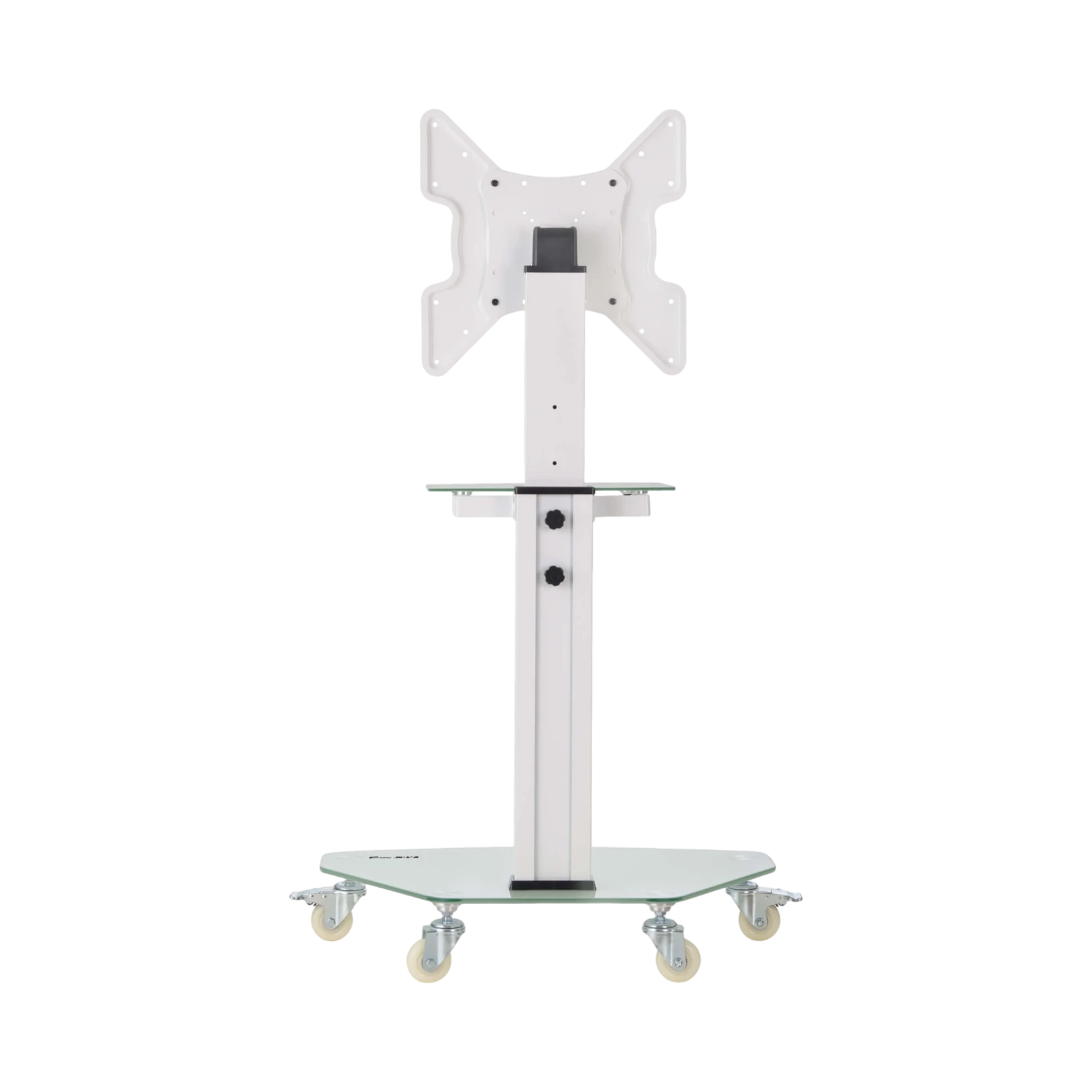 This cart is designed to work with a wide variety of displays thanks to its support for standard VESA mounting patterns ranging from 75x75 to 400x400. This ensures compatibility with most modern TVs, monitors, and digital whiteboards within the 32 to 55-inch size range. The shelf provides space for additional devices such as laptops, media players, or projectors, making it a flexible solution for multimedia setups.